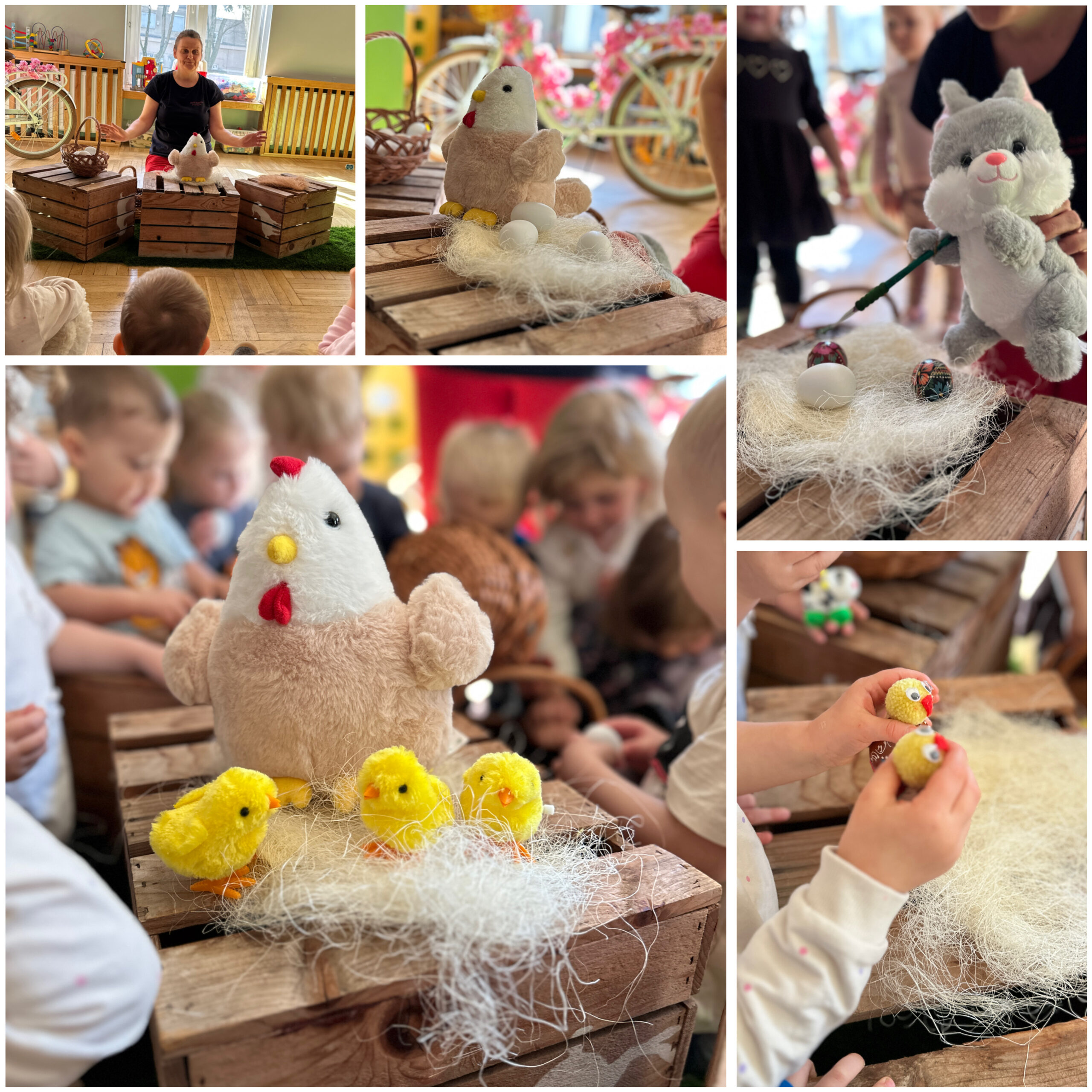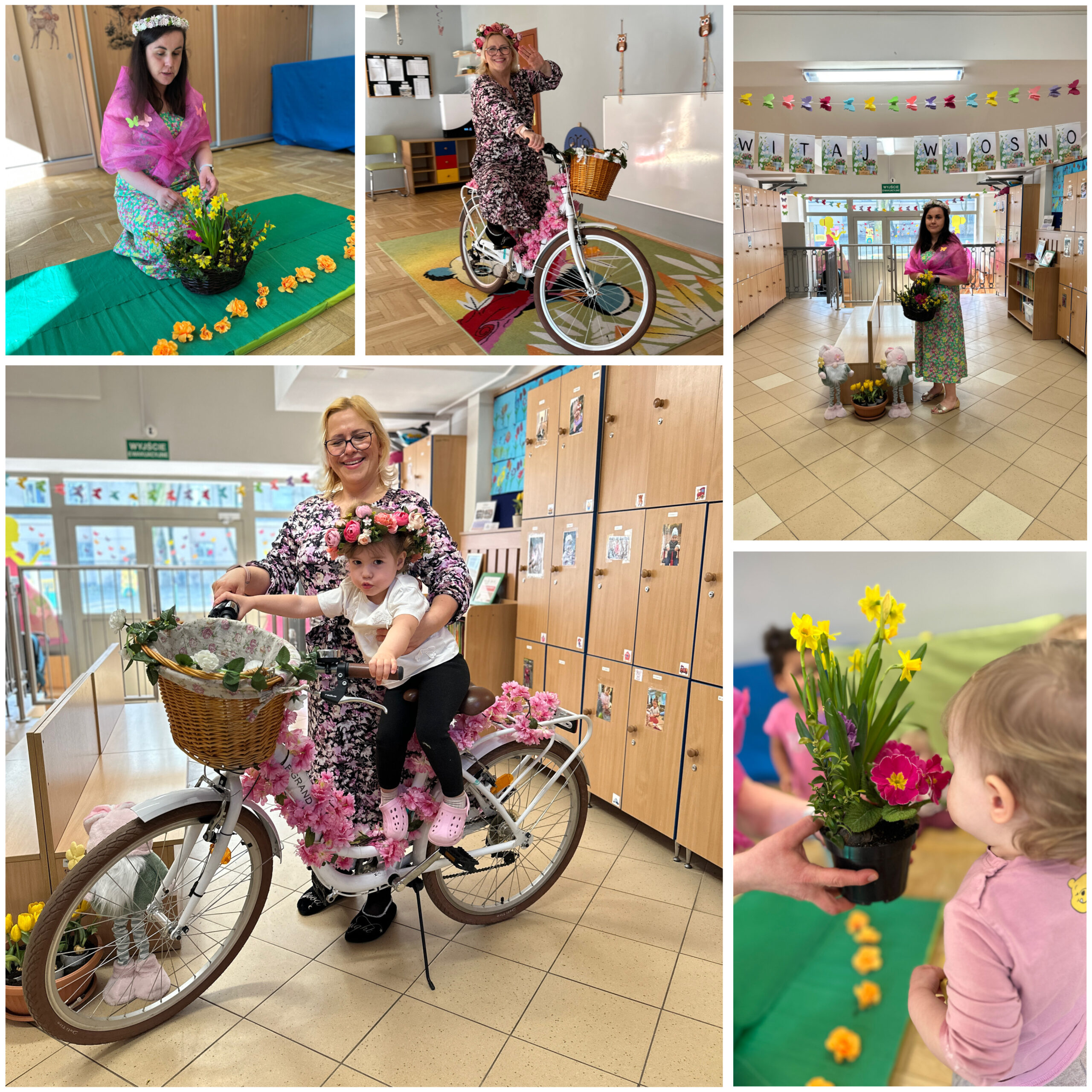 Wyjątkowym wydarzeniem był dzień, w którym odwiedziła nas Pani Wiosna. Przyjechała rowerem, niosąc ze sobą kwiaty i radość. Dzieci witały ją piosenkami, tańcami i wierszykami, a w salach zagościł prawdziwie wiosenny nastrój. Spotkanie stało się inspiracją do rozmów o przyrodzie, zmianach w otaczającym nas świecie i pierwszych oznakach wiosny.