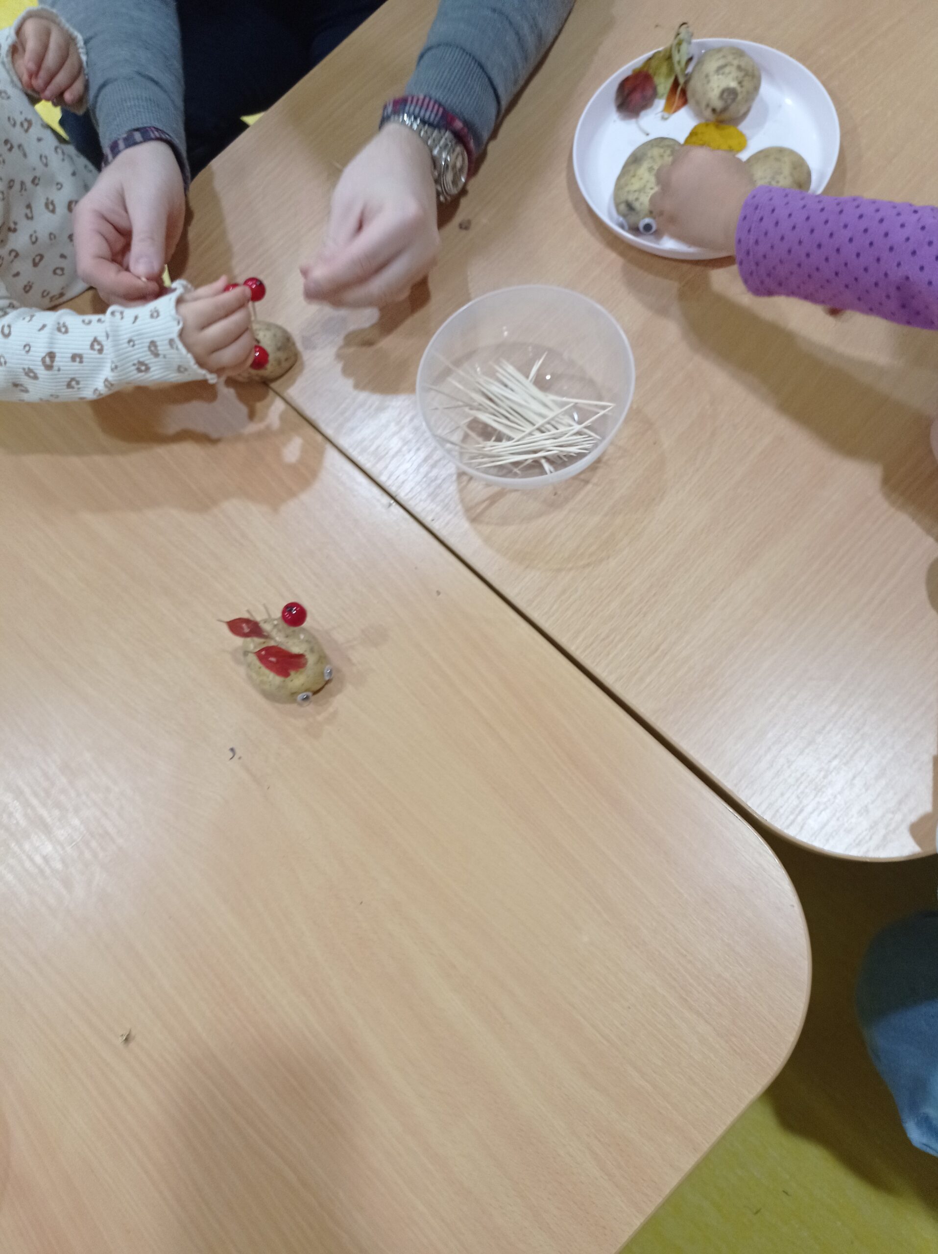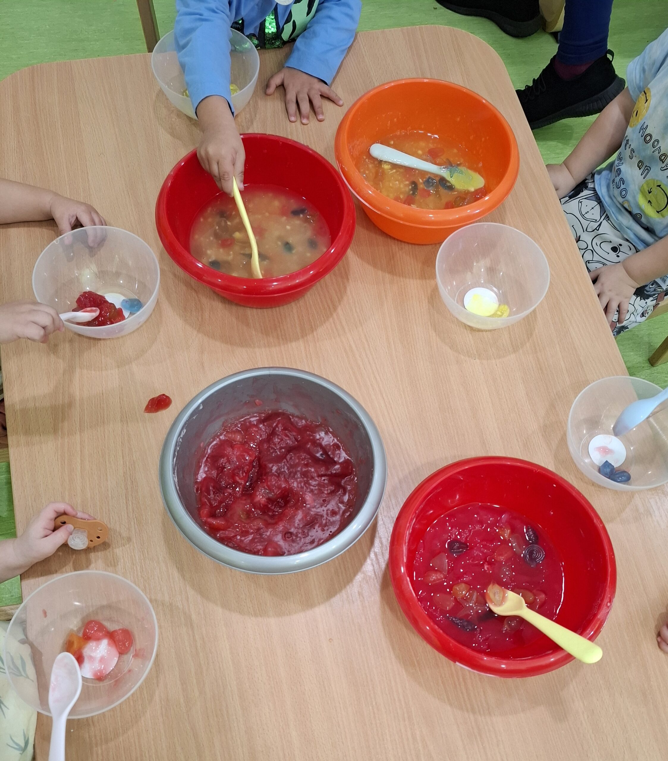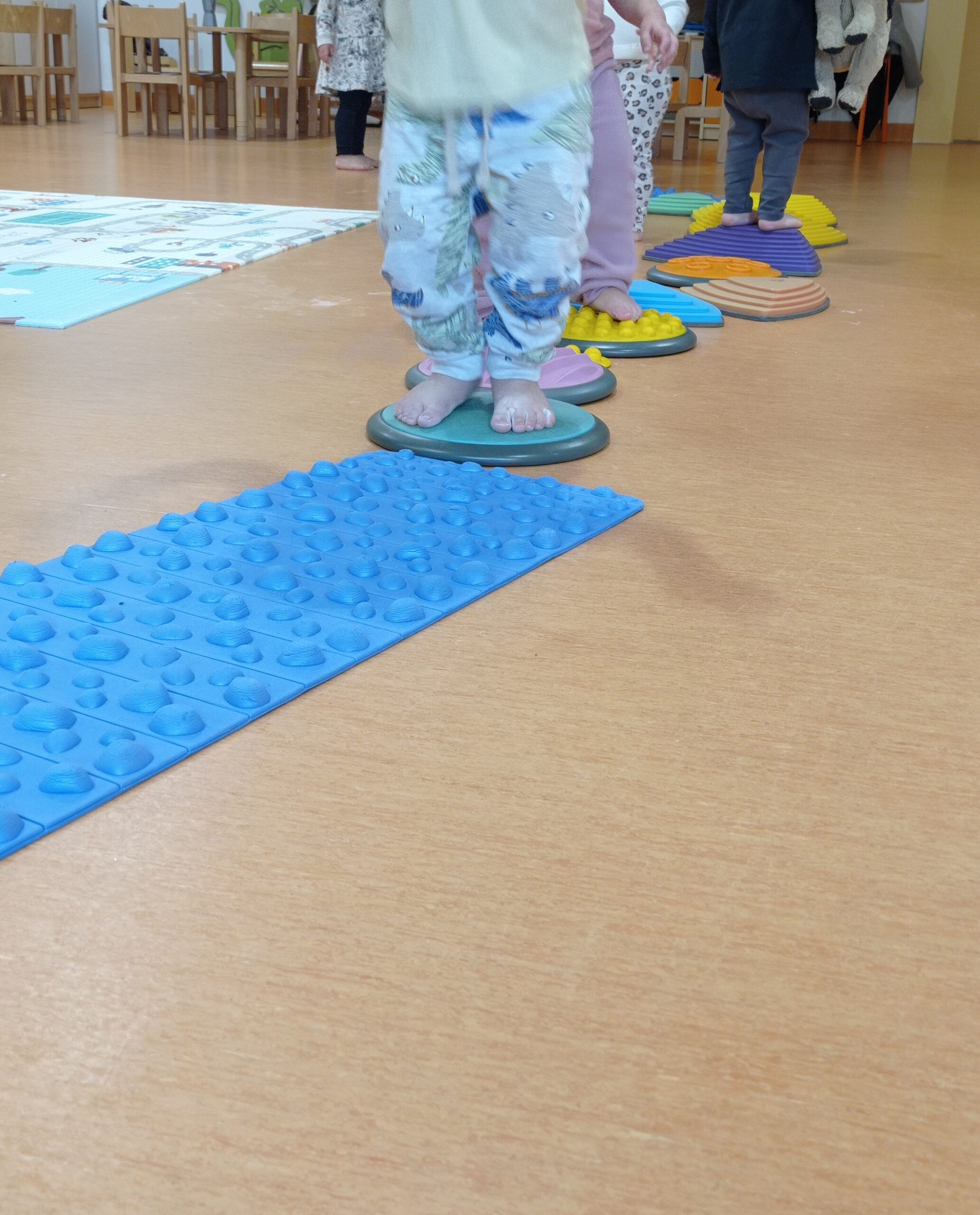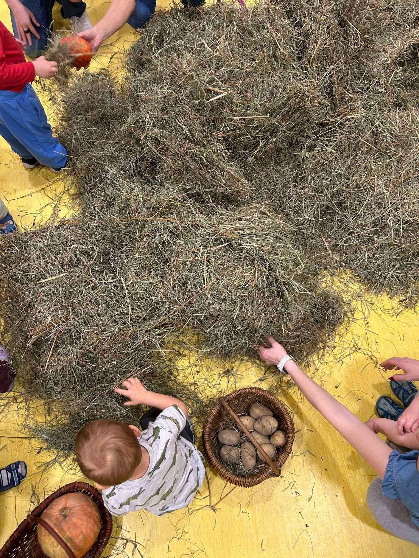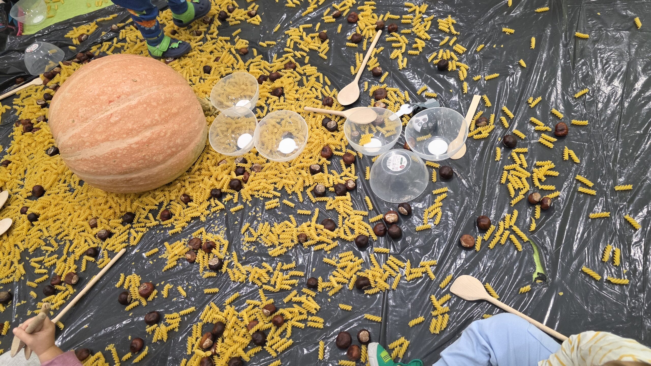 Podczas spotkań rozmawialiśmy o zmieniającej się pogodzie – o wietrze, deszczu i spadających liściach. Dzieci oglądały jesienne skarby: kasztany, żołędzie, kolorowe liście i dynie. W czasie zabaw sensorycznych maluchy mogły dotykać, przesypywać, wąchać i oglądać różne jesienne materiały, rozwijając w ten sposób ciekawość i zmysł dotyku.