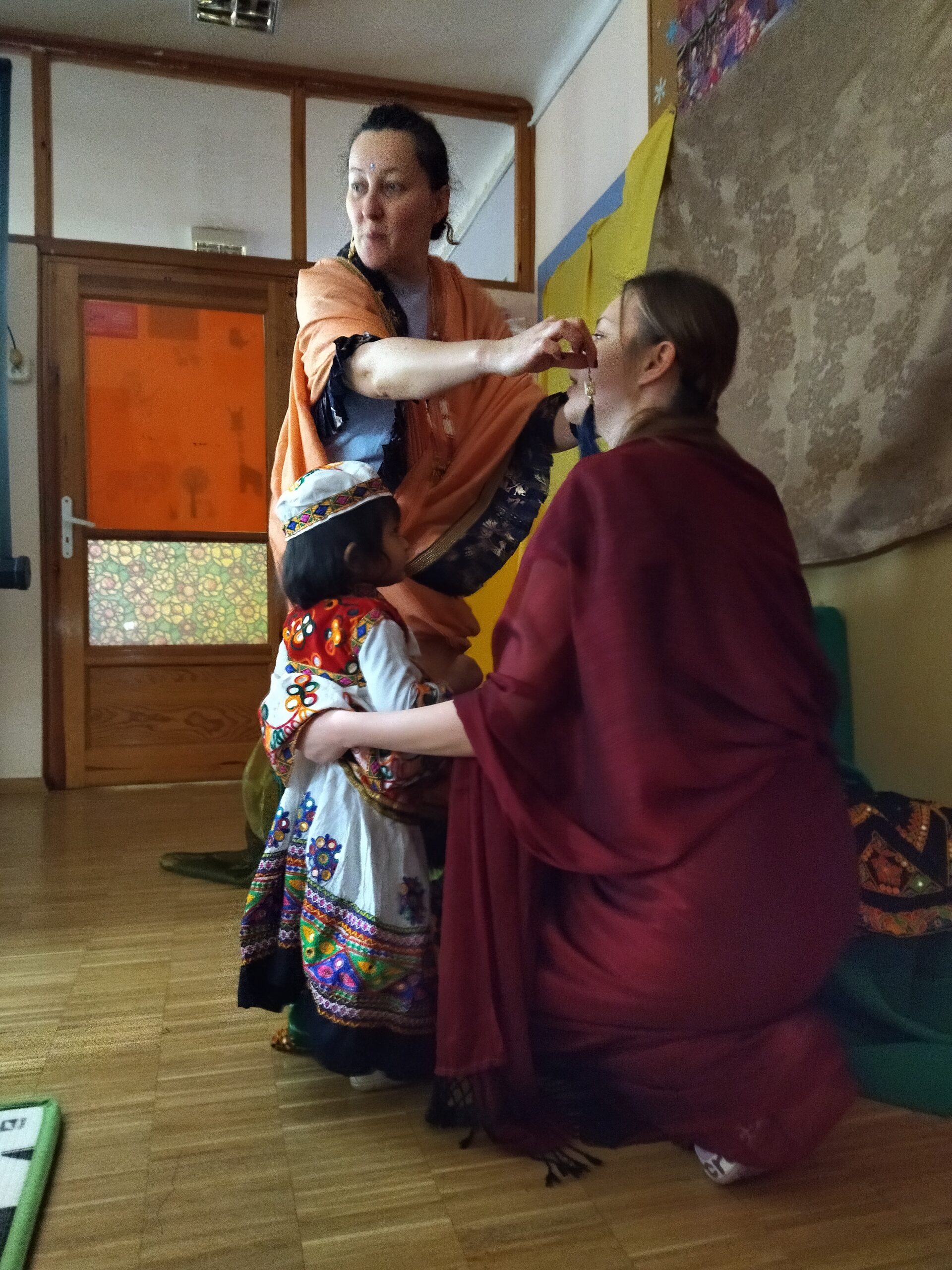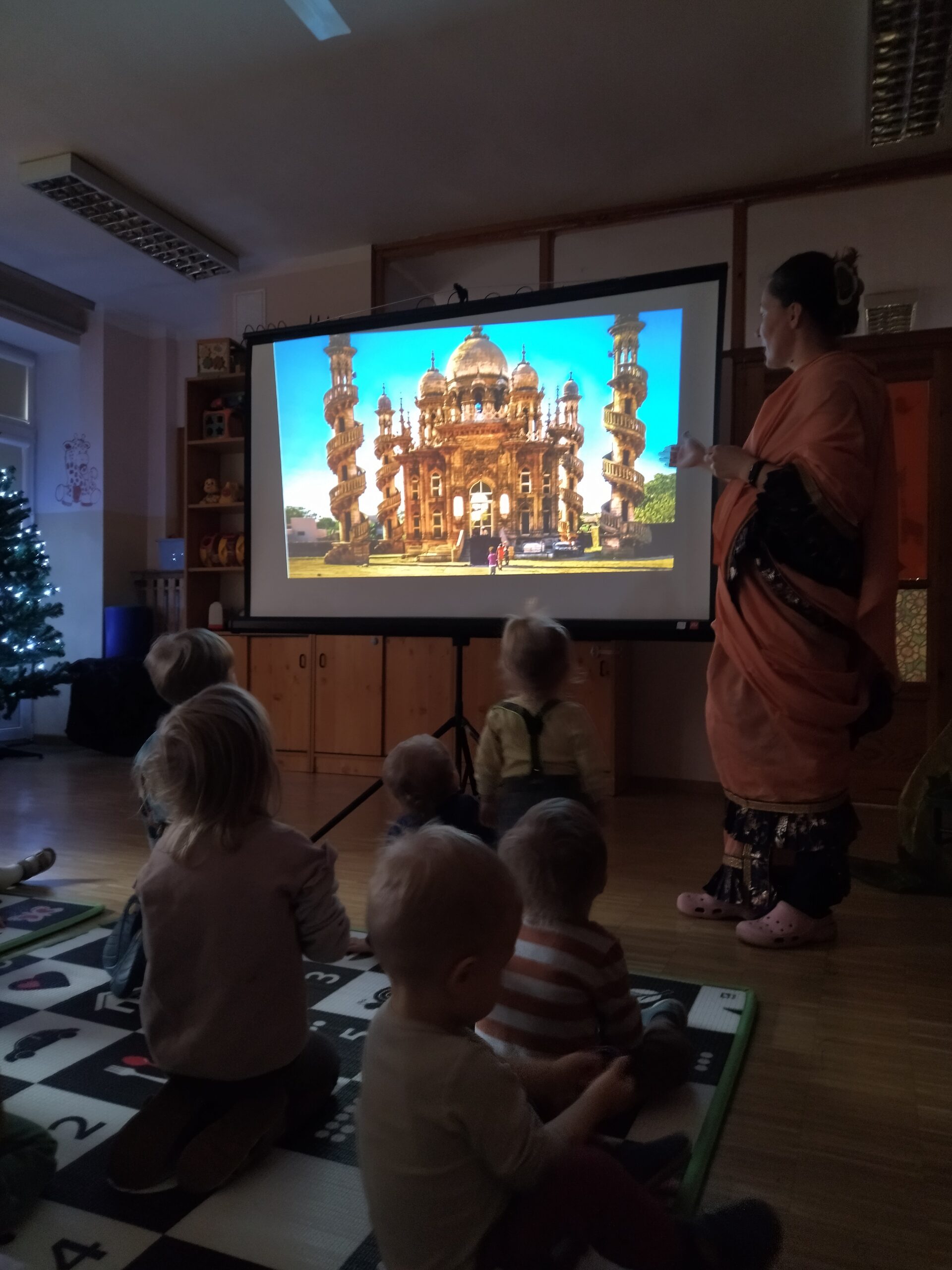 W grupie II oraz III dzieci brały udział w zajęciach o Indiach. Panie Opiekunki opowiedziały dzieciom o indyjskich kolorowych strojach, aromatycznych przyprawach, niesamowitych budowlach oraz wyjaśniły gdzie ten kraj się znajduje. Dzieci mogły również przymierzyć indyjską biżuterię. Na sam koniec maluszki stworzyły prace plastyczną przedstawiająca indyjskiego słonia – który został wyklejony tasiemkami i papierem.
