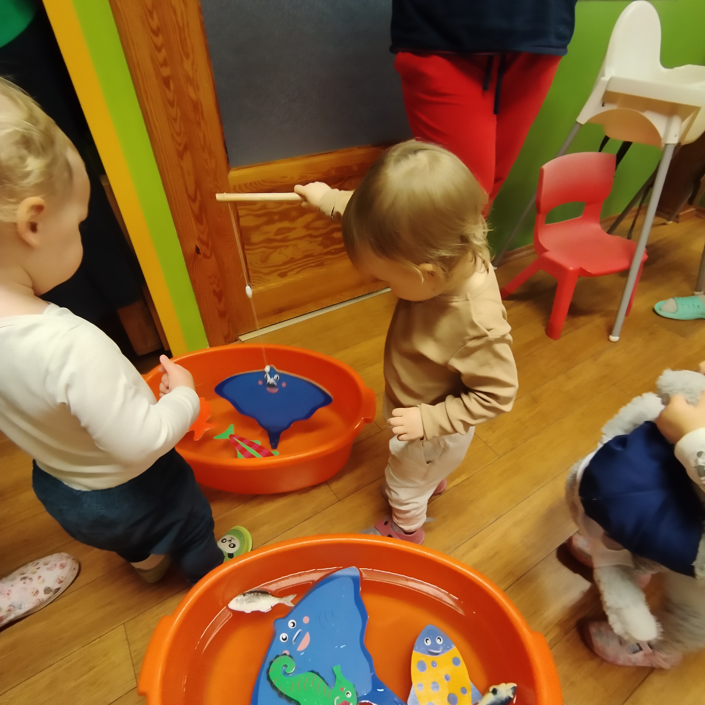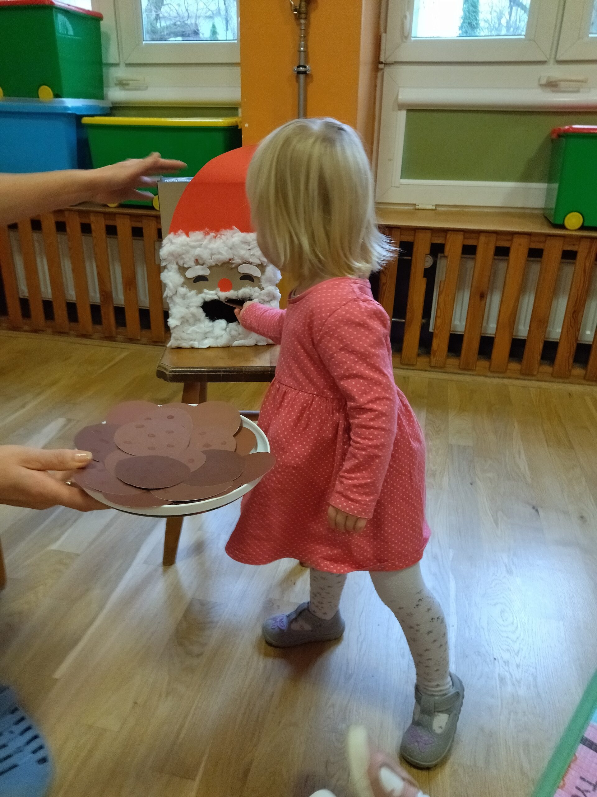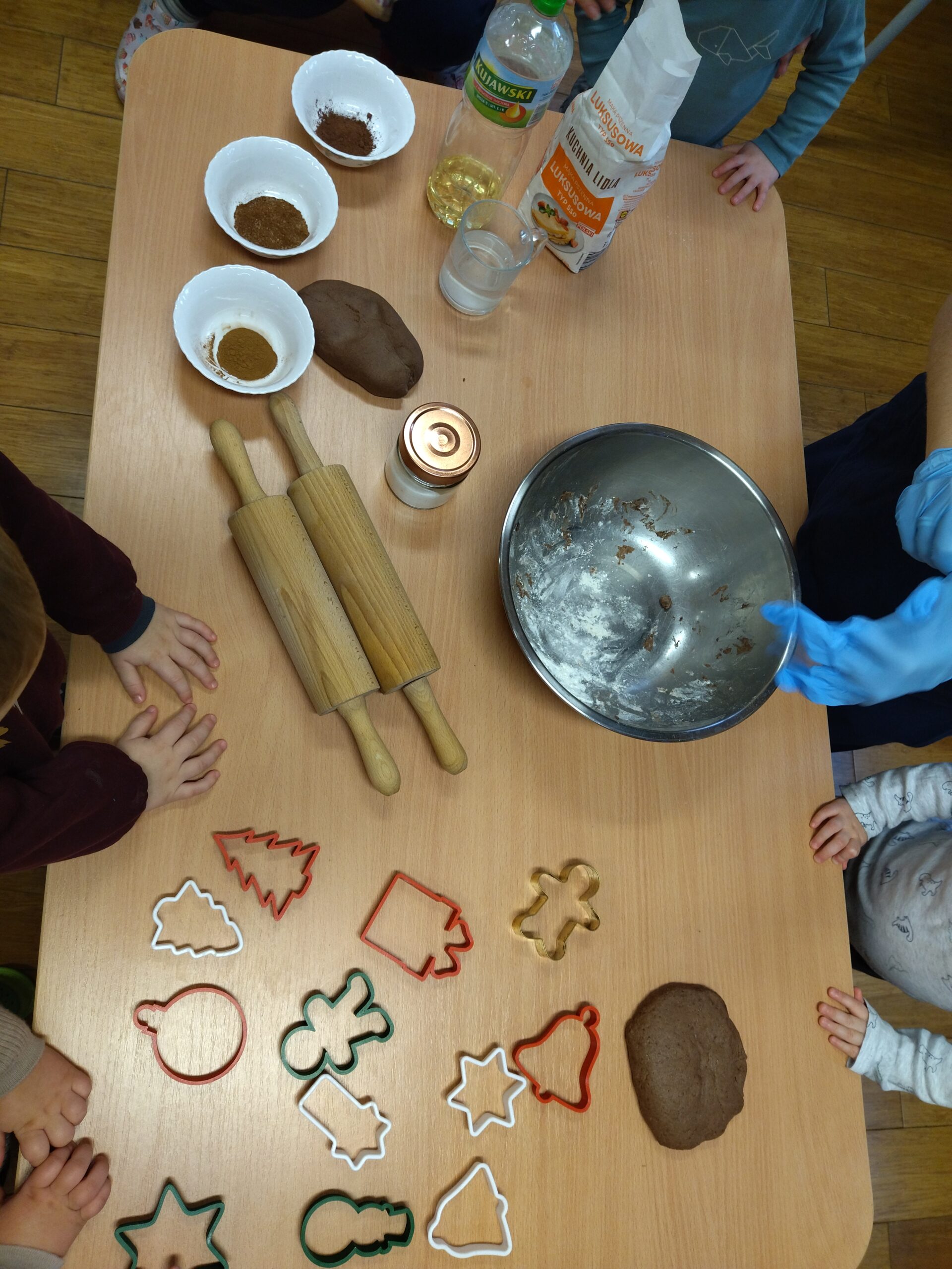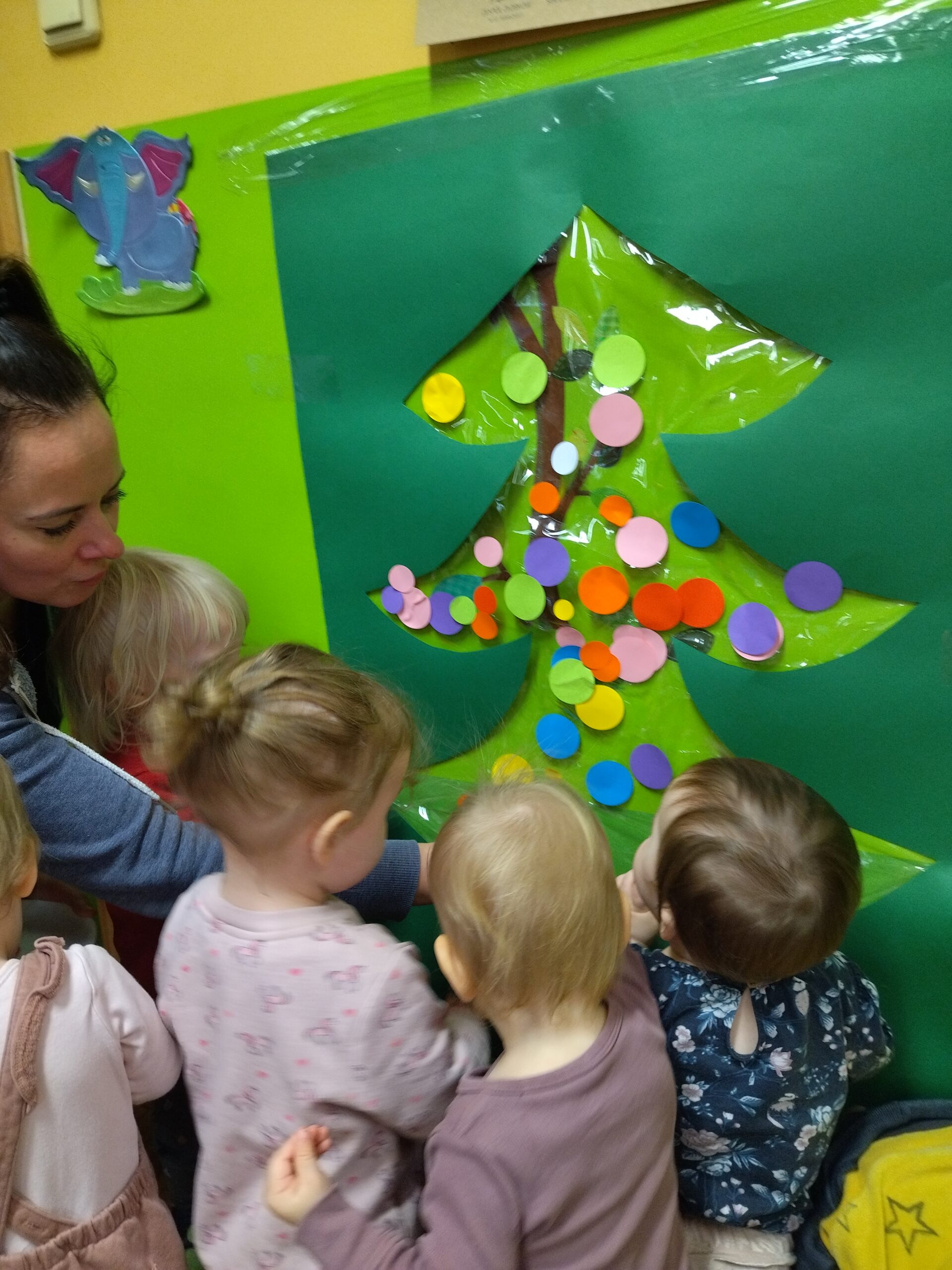 Grupa I skupiła się na podtrzymywaniu tradycji świątecznych. Dzieci wraz z Paniami Opiekunkami wyrabiały ciasto na pierniki z masy solnej, a następnie wycinały świąteczne pierniczki. Powstały pierniczki w kształcie: dzwonków, choinek, bombek, gwiazd i bałwanków. To była niezwykle aromatyczna zabawa sensoryczna! Odbyły się również zajęcia o świątecznym drzewku – choince. Dzieci wysłuchały opowieści o drzewku świątecznym, dowiedziały się gdzie możemy znaleźć takie drzewko, a następnie wykonały pracę plastyczną – za pomocą kolorowych bombeczek wyciętych z papieru ubrały piękną choinkę. W tej grupie dzieci świętowały również Dzień Ryby. Pani Opiekunka opowiedziała o rybach, gdzie żyją, jakie mają kształty oraz w jakiej wodzie lubią pływać. Chętne dzieci mogły za pomocą małej wędki łowić drewniane rybki zanurzone w miskach z wodą. To była niewątpliwie super zabawa!