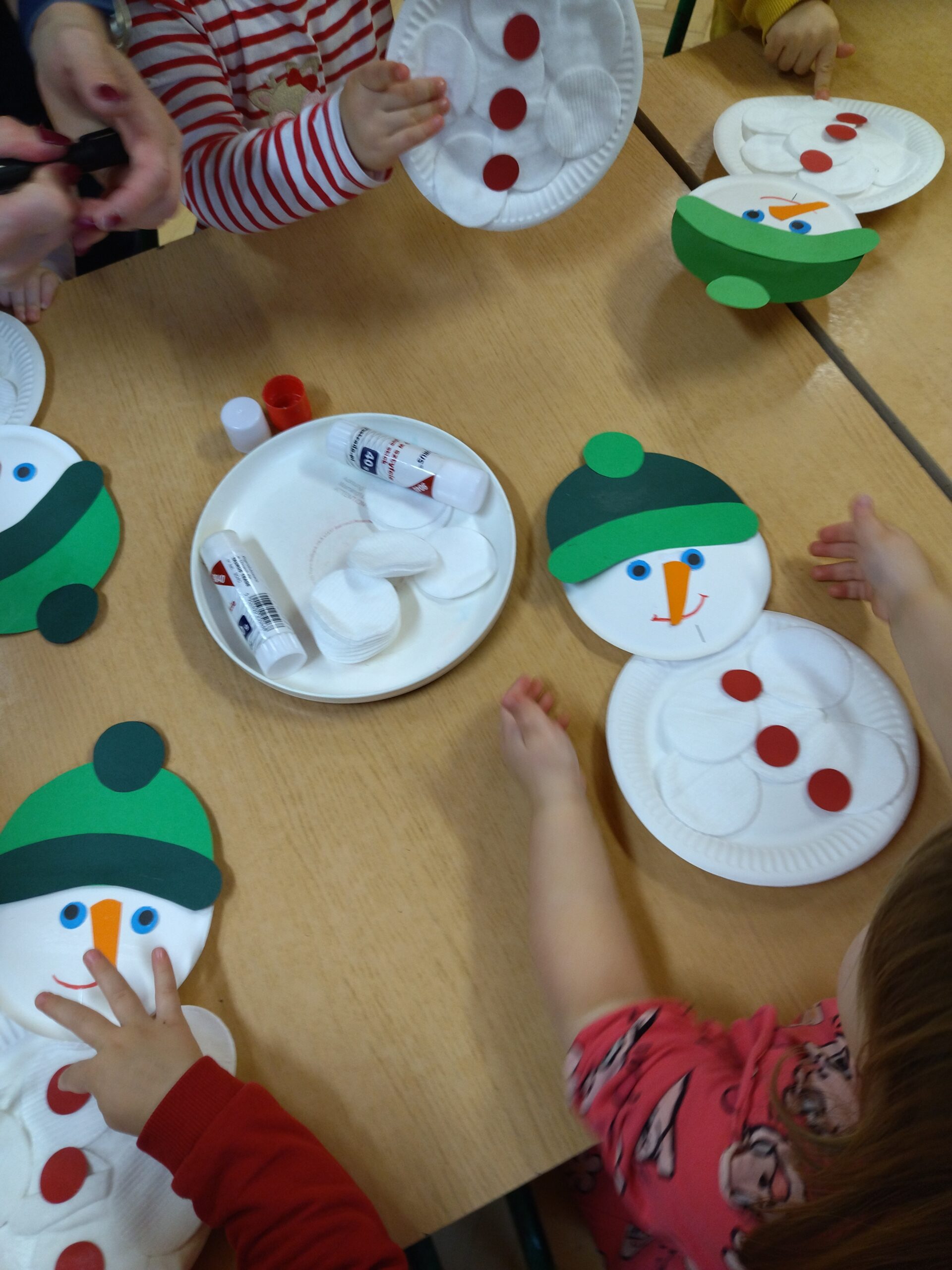 Grupa IV również skupiła się na tematyce świątecznej. Poznaliśmy bliżej Świętego Mikołaja. Dowiedzieliśmy się skąd pochodzi Święty Mikołaj, jak jest ubrany oraz kto pomaga pakować Mikołajowi prezenty. Dzieci dowiedziały się, że Mikołaj bardzo lubi jeść ciasteczka, dlatego nakarmiły Świętego Mikołaja wyciętego z kartonu papierowymi ciasteczkami. Następnie maluszki stworzyły list do Świętego Mikołaja naklejając wycięte z papieru prezenty na list. Bez wątpienia Święty Mikołaj w tym roku ma do zapakowania bardzo dużo prezentów! Odbyły się również zajęcia o zimowym bałwanku. Dzieci dowiedziały się z czego możemy ulepić bałwanka oraz jakimi rekwizytami możemy go ozdobić. Następnie maluszki zatańczyły do piosenki o bałwanku. Na sam koniec powstała praca plastyczna – za pomocą papierowych talerzyków, guziczków, papierowych oczek, kapelusza oraz marchewkowego noska wykonaliśmy pięknego bałwanka.