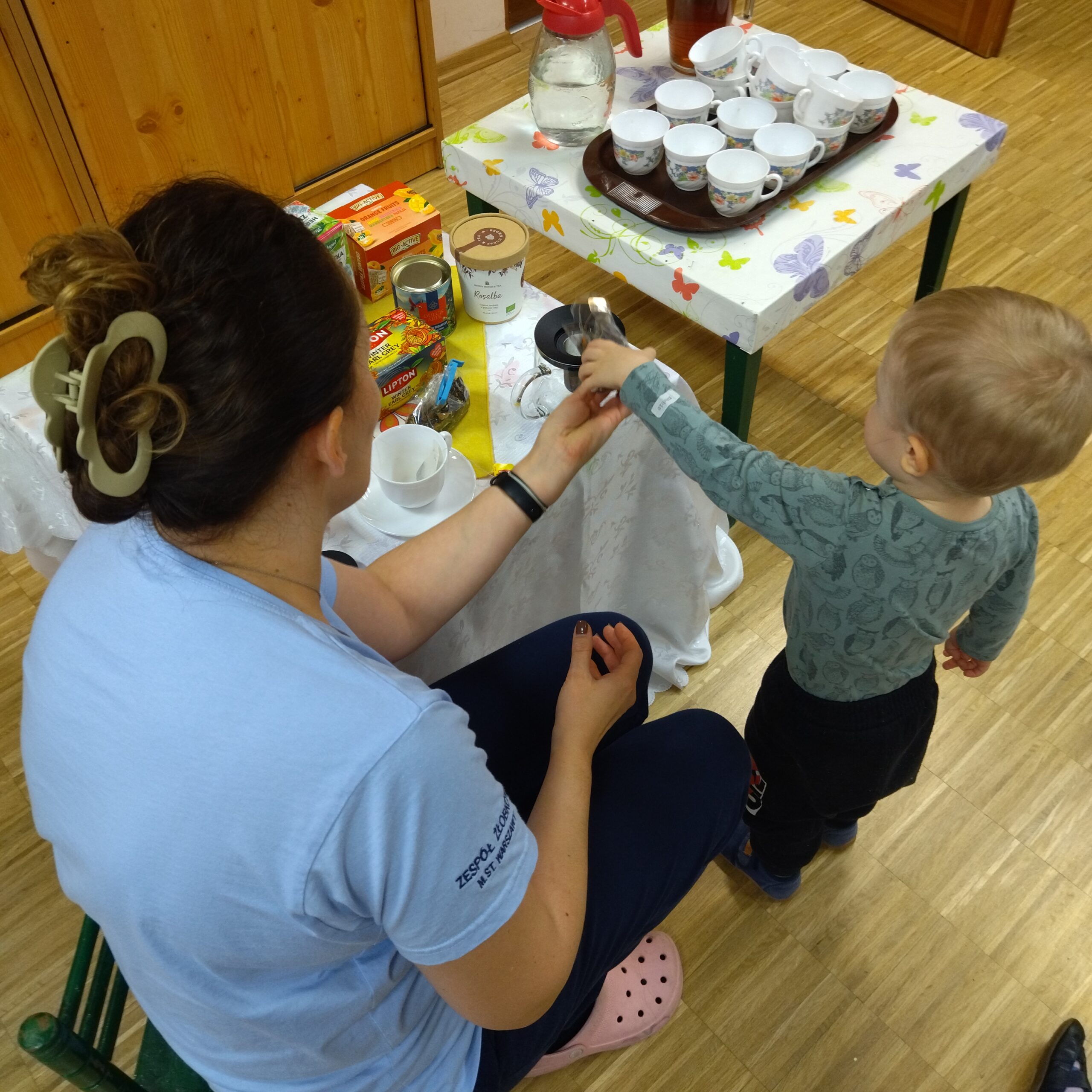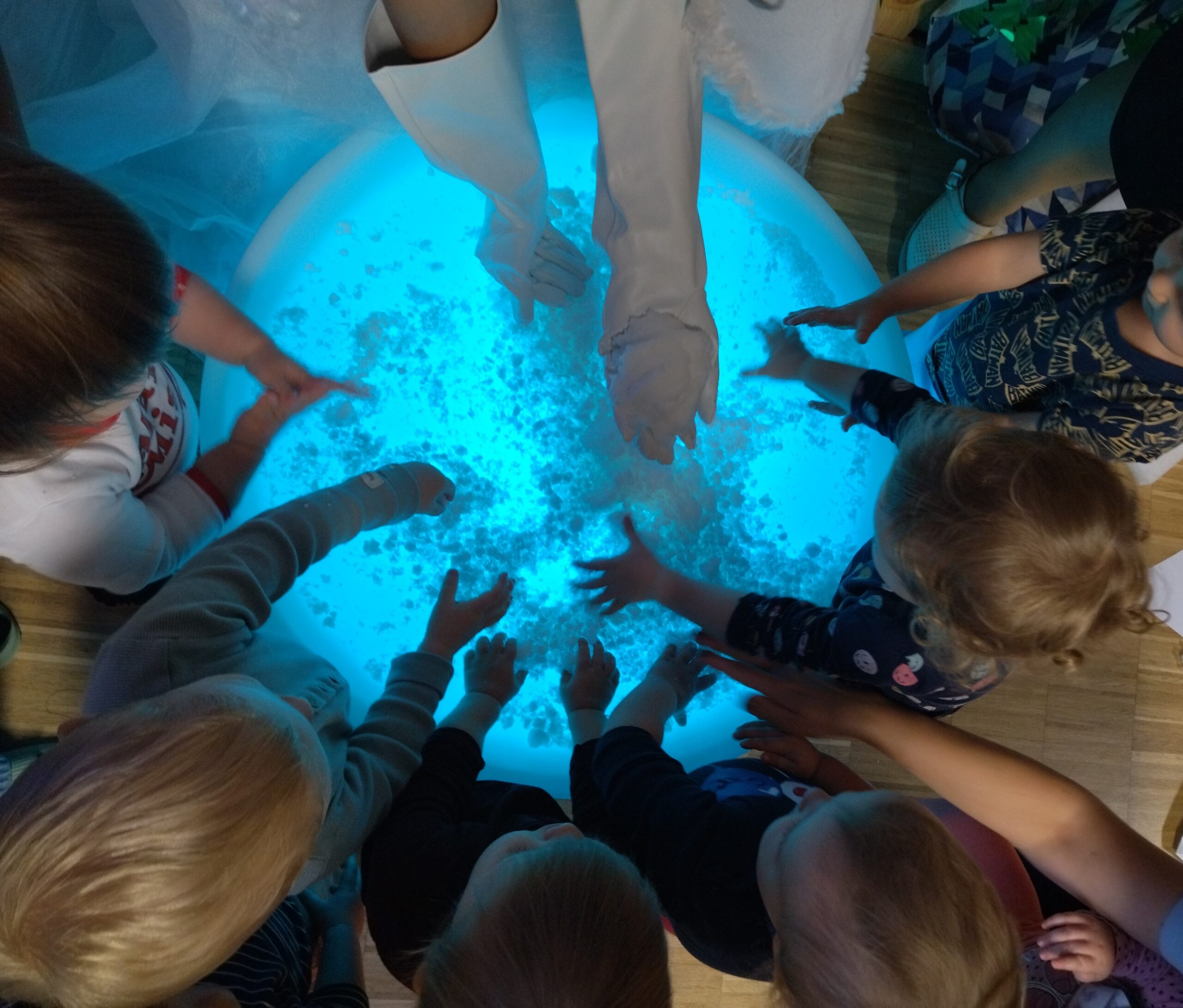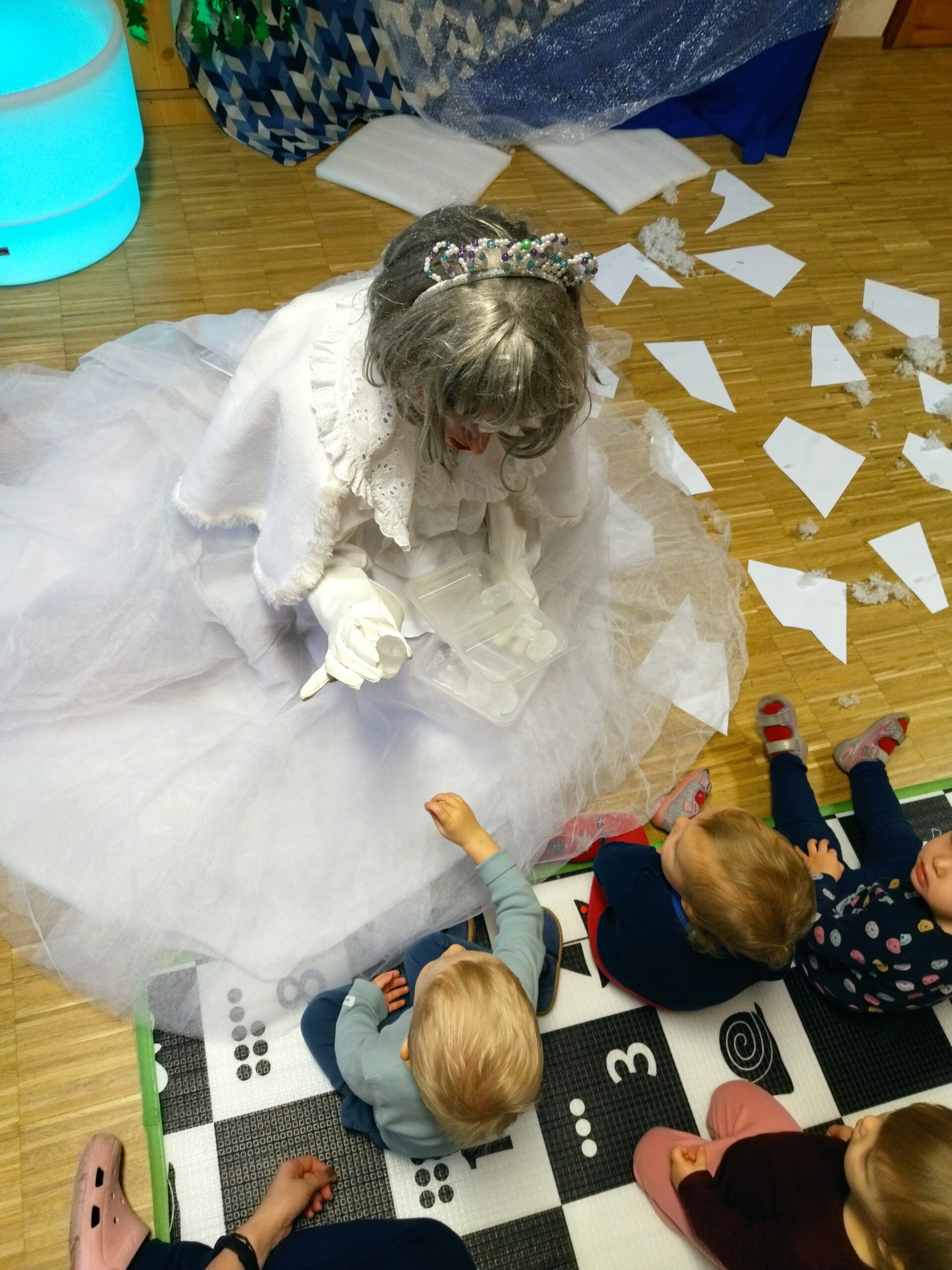 W grupie II dzieci dowiedziały się cennych informacji o zimowym rozgrzewającym napoju – herbatce. Pani Opiekunka opowiedziała dzieciom gdzie rośnie herbata, jak wygląda, jaki ma zapach oraz z dodatkiem jakich składników możemy zaparzać herbatę. Dzieci wspólnie z Opiekunką zaparzyły zimową herbatę, a następnie każde chętne dziecko spróbowało jaki ma smak. Na sam koniec dzieci wykonały pracę plastyczną, polegającą na wyklejaniu filiżanki gwiazdkami oraz kropeczkami. Grupę II oraz III odwiedziła również „Pani Zima” – ubrana była w piękną białą suknię, na głowie miała diadem i przyniosła ze sobą kostki lodu. Dzieci poznały bliżej Panią Zimę, dowiedziały się skąd pochodzi, dlaczego jest ubrana na biało oraz skąd się bierze śnieg. Maluszki razem z Panią Zimą stworzyły sztuczny śnieg, a następnie formowały śnieżki. Na sam koniec powstał śnieżny bałwanek, którego maluchy wykleiły watą, przyczepiły papierowe guziczki, kapelusz, oczka oraz marchewkowy nosek!
