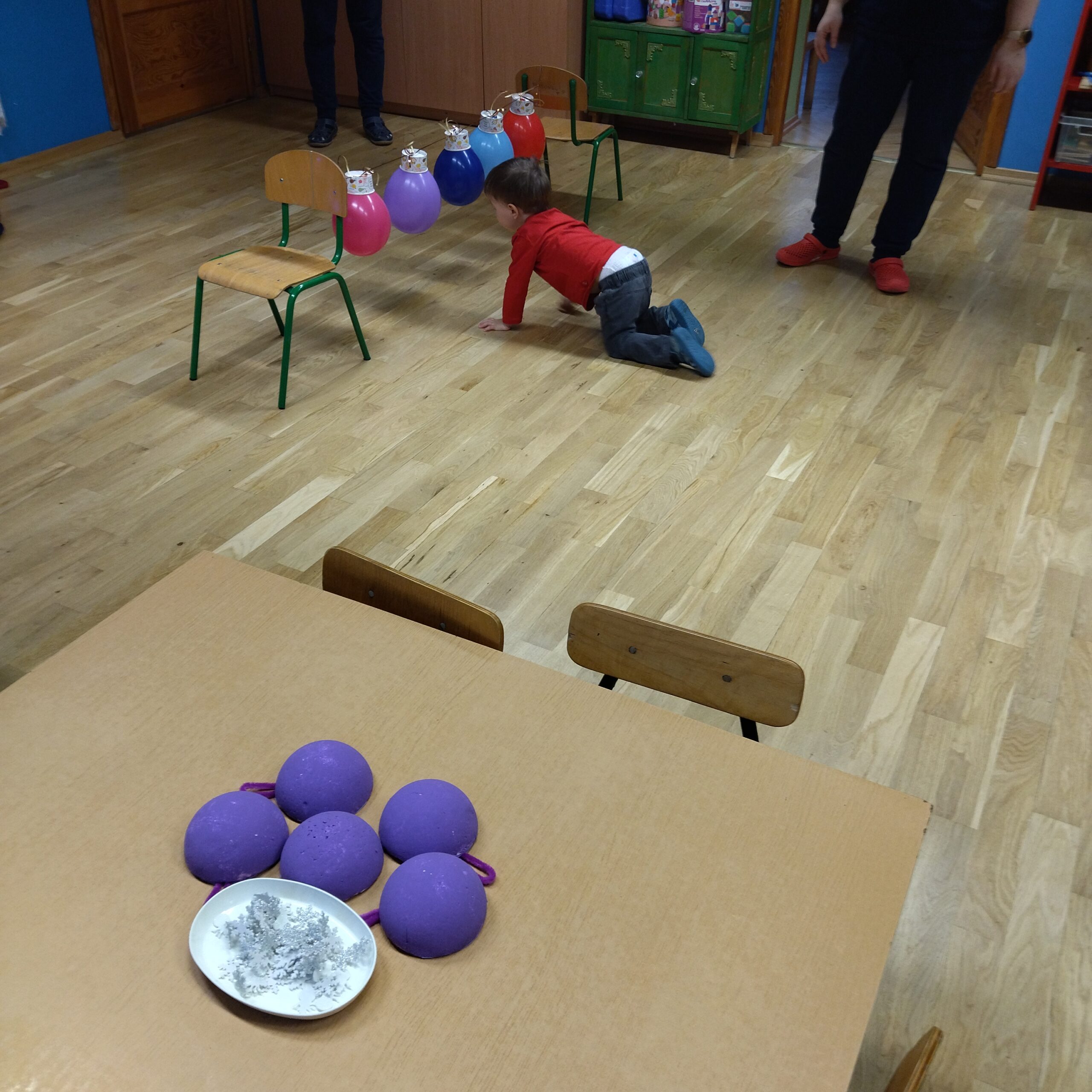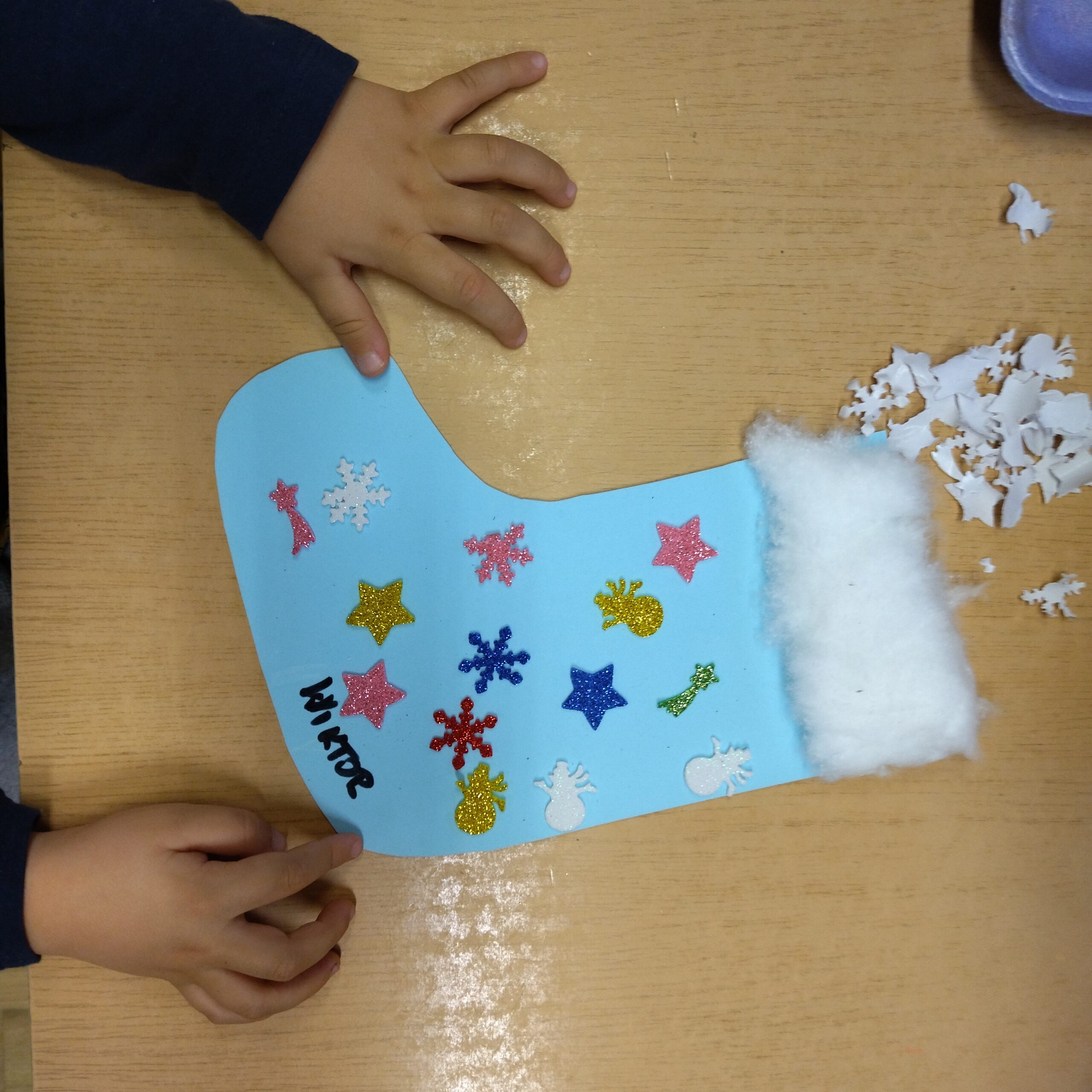W grupie V odbył się świąteczny tor przeszkód. Dzieci z pomocą Pań Opiekunek miały za zadanie pokonać przeszkody stworzone z balonów, kawałków papierów, krzesełek oraz tunelu. Na sam koniec maluszki ozdobiły śnieżynkami styropianowe iglo. Odbyły się również zajęcia o świątecznej skarpetce, w której ukryte są prezenty. Wszyscy dowiedzieli się kiedy wywiesza się taką skarpetkę, oraz co w niej możemy znaleźć. Dzieci na sam koniec stworzyły kolorowe skarpety, które przyozdobiły śnieżynkami, cekinami oraz watą.