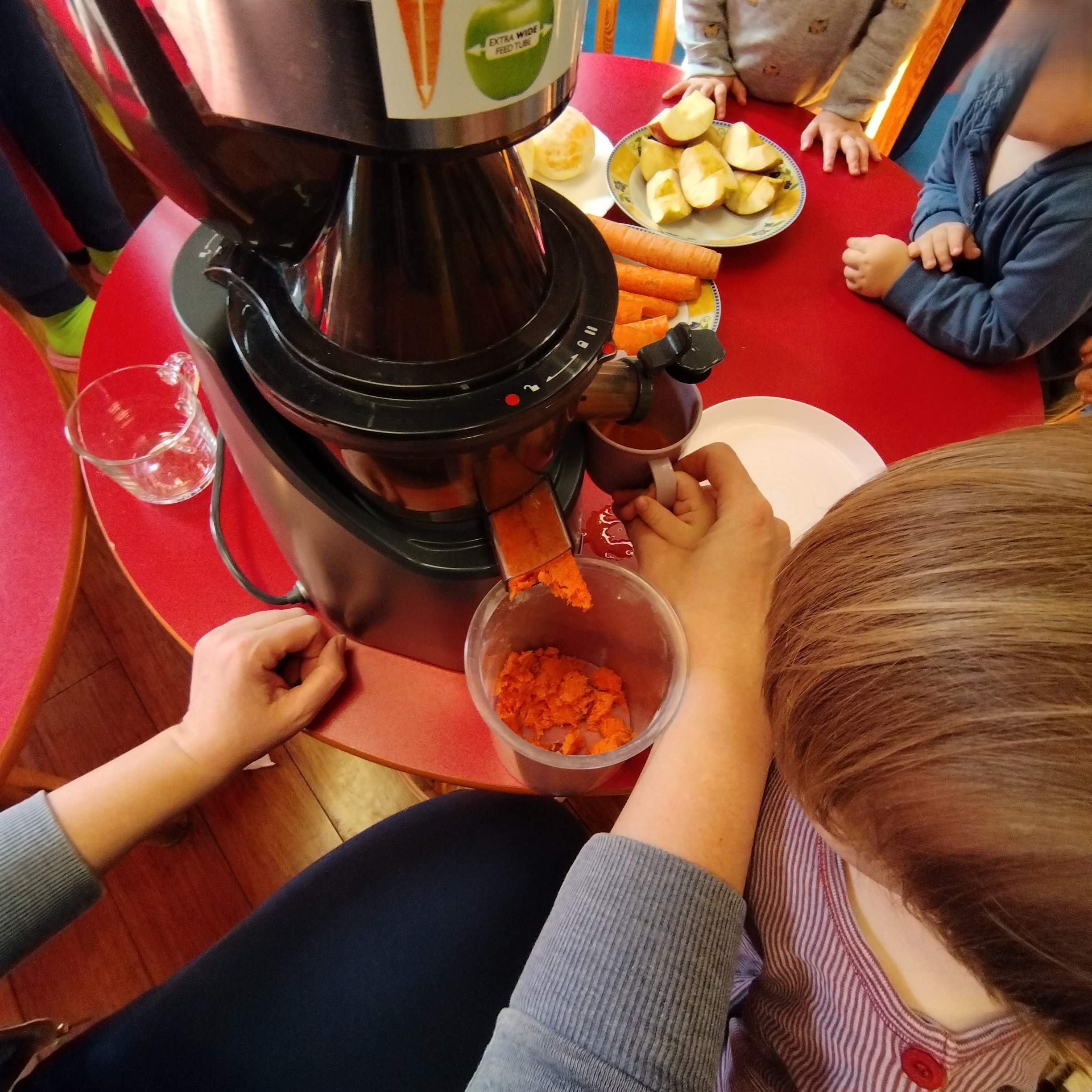 W Grupie I dzieci z pomocą Pań Opiekunek tworzyły owocowo-warzywne soki, które później mogły spróbować. Odbyły się również aktywności o bocianie, który przylatuje do nas na wiosnę oraz o lodowych karmnikach dla ptaków. Dzieci brały udział również w aktywnościach ruchowych i torze przeszkód oraz w eksperymentach, które były tworzone z naturalnych składników.