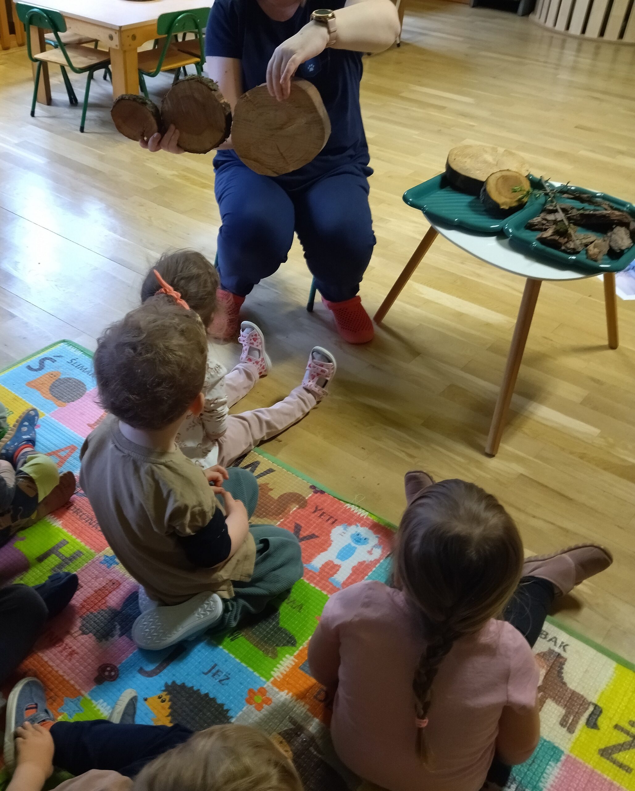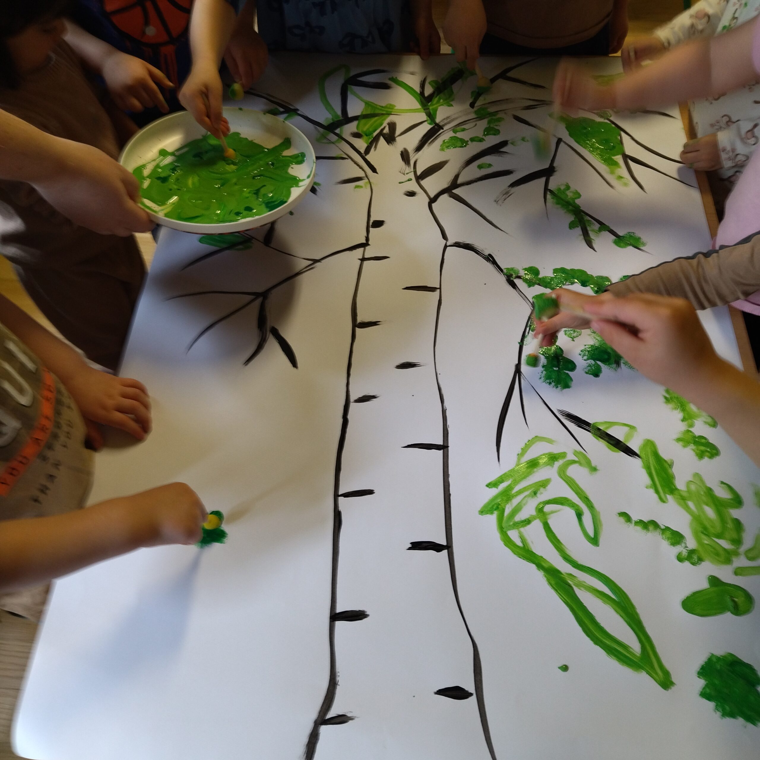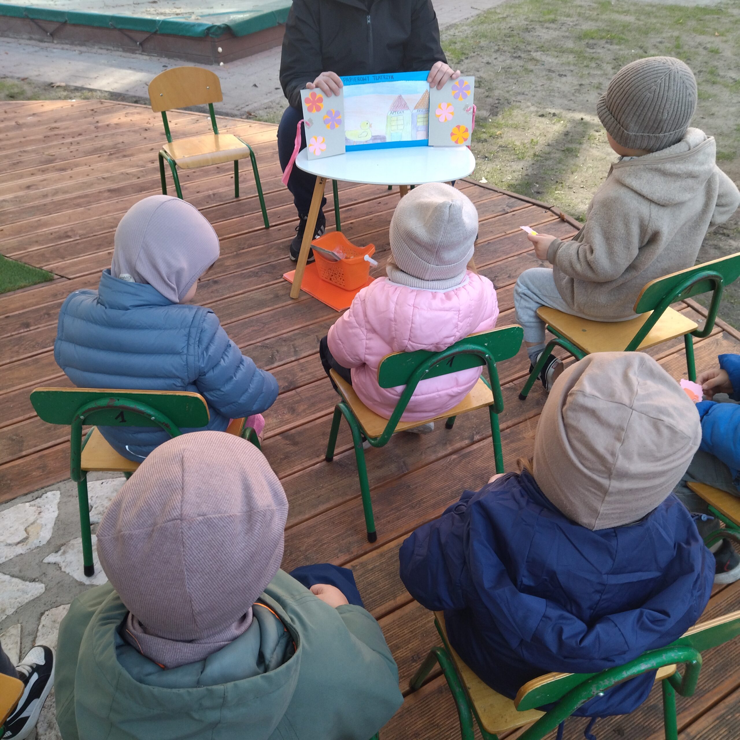 Grupa V wraz z Paniami Opiekunkami tworzyła wiosenne drzewko, ozdabiając je farbą. Dzieci dowiedziały się jak wygląda marcowa pogoda i czym ona się charakteryzuje. Korzystając z pięknej wiosennej aury Pani Opiekunka przygotowała dzieciom w ogrodzie wystąpienie teatralne o Kaczce Dziwaczce.