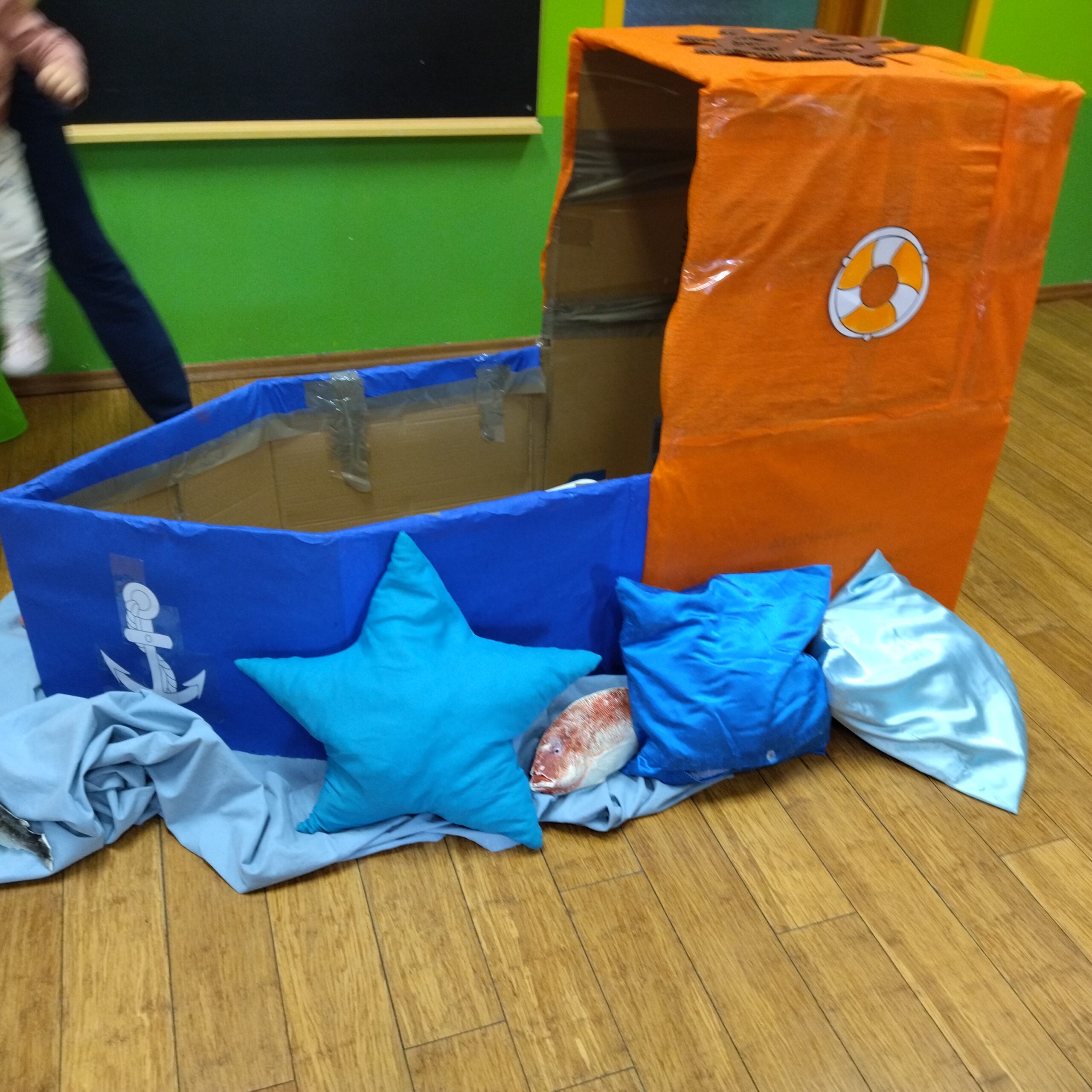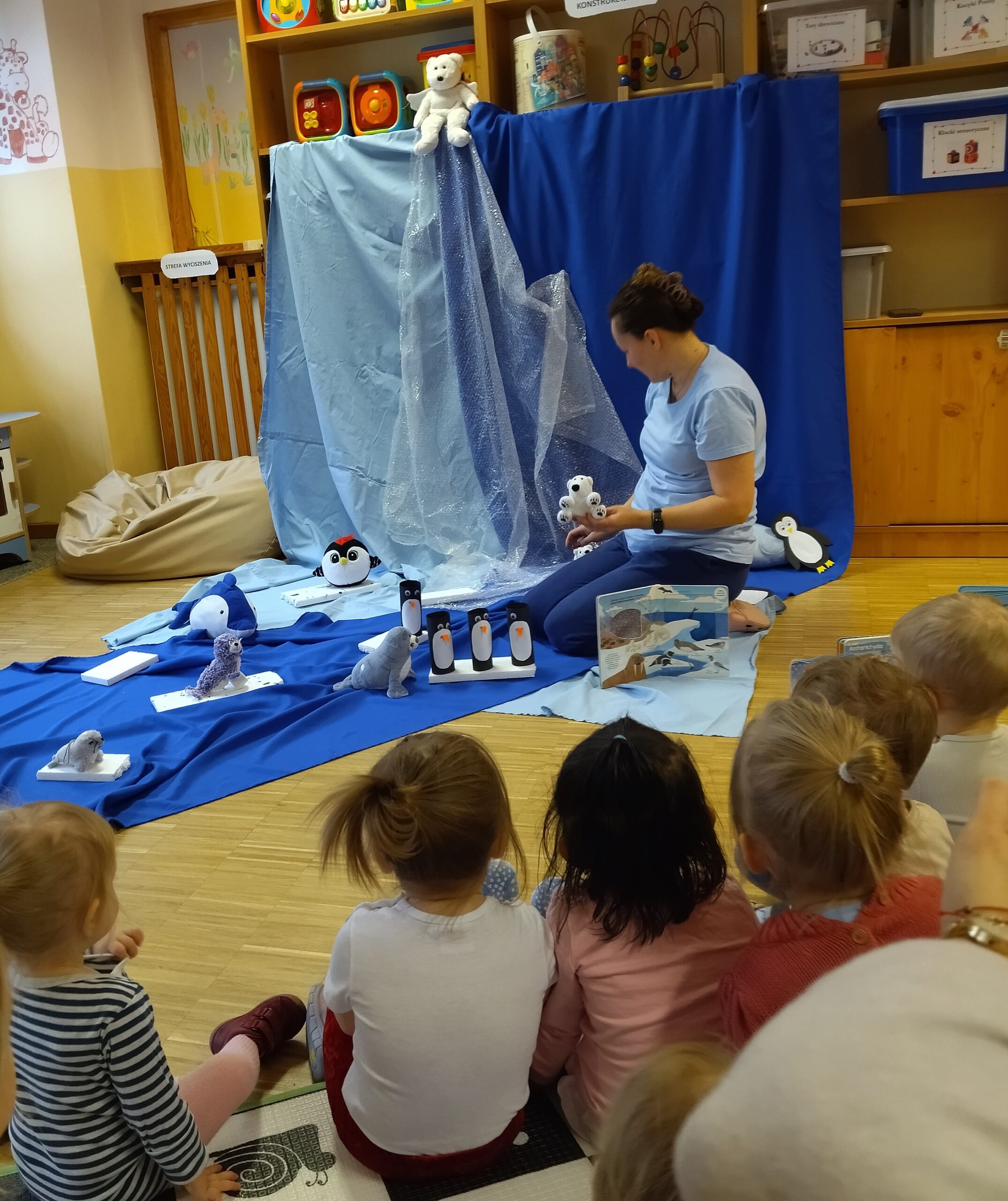 Grupa I skupiła się na poznawaniu trwającej pory roku – zimy. Chętne dzieci wraz z Paniami Opiekunkami lepiły bałwanki z masy ziemniaczanej, natomiast pozostała część grupy miała utworzony tor przeszkód. Pani opiekunka opowiedziała dzieciom z jakich elementów składa się zimowy bałwanek oraz jakie ma w swoim wyglądzie charakterystyczne cechy. W tej grupie dzieci również poznały bliżej typowo zimnolubne zwierzątko – pingwinka. Dzieci wysłuchały opowiadania o pingwinku, dowiedziały się gdzie mieszka, gdzie go możemy spotkać, jaki ma kolor oraz co lubi jeść. Każde dziecko miało okazję oglądać i dotykać pluszowe pingwinki, a następnie chętne dzieci wyklejały brzuszek pingwinka watą. Powstały piękne zimowe prace! Pozostała część grupy w tym czasie bawiła się tunelem oraz piłeczkami. Odbyły się również aktywności z udziałem kartonowego statku. Chętne dzieci mogły wejść do kartonowego statku i poczuć się jak prawdziwi marynarze! Natomiast pozostała część grupy oglądała książeczki i bawiła się zabawkami sensorycznymi. Cała scenografia zawierała fale zrobione z różnych tkanin oraz pluszowe i plastikowe zwierzątka morskie. Cóż to była za wspaniała przygoda!