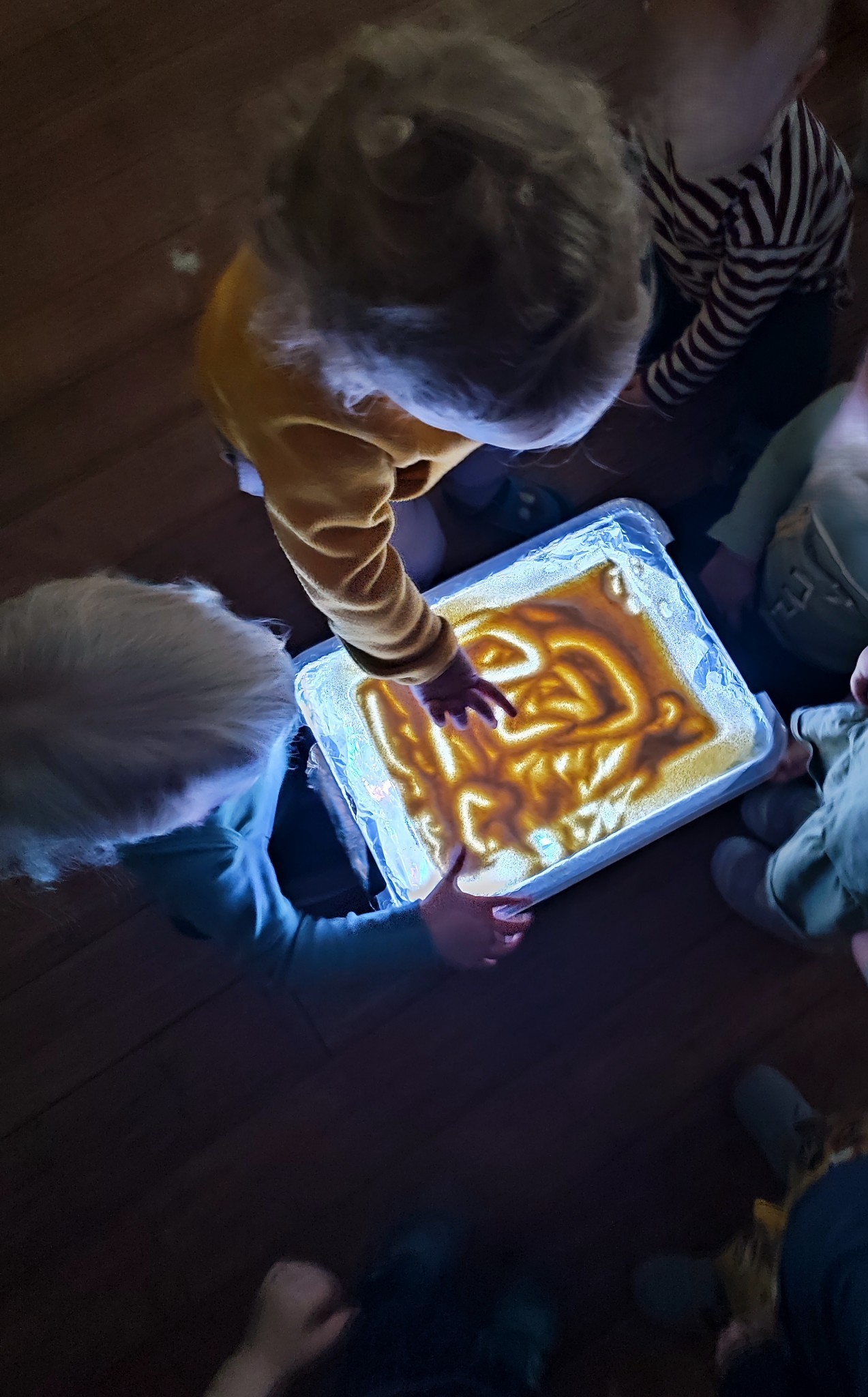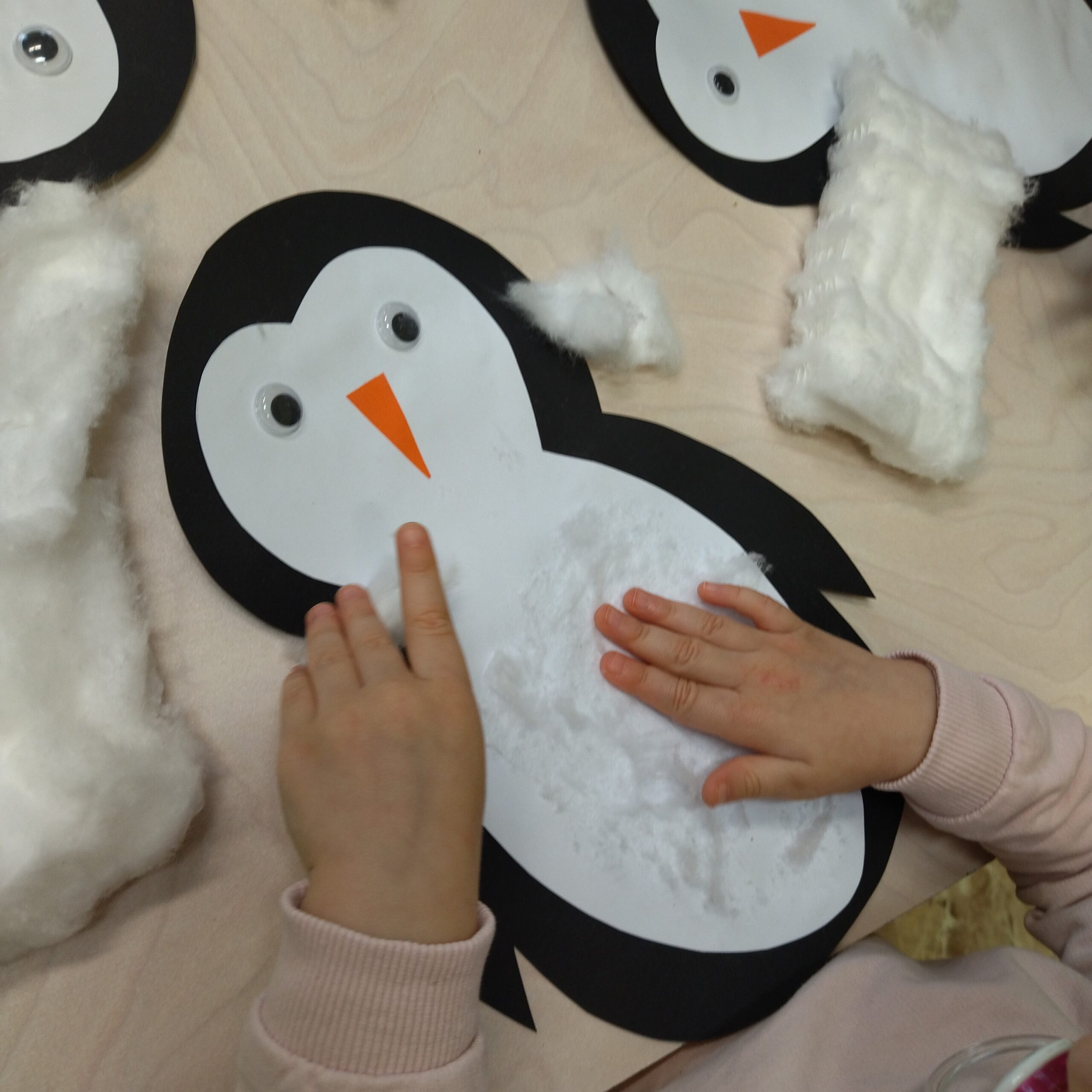 W grupie II dzieci dowiedziały się cennych informacji o Sylwestrze. Pani Opiekunka za pomocą pacynek przestawiła dzieciom krótki teatrzyk o starym oraz nowym roku. Następnie dzieci chętne tańczyły do muzyki oraz wykonały pracę plastyczna przedstawiającą sylwestrowe fajerwerki powstałe z farb i brokatu. Dzieci, które nie chciały brać udziału w tych aktywnościach mogły w tym czasie relaksować się w wybranym przez siebie kąciku zabaw. Grupa II podobnie jak grupa I poznała bliżej typowo zimnolubne zwierzątko – pingwinka. Dzieci dowiedziały się od Pani Opiekunki gdzie żyją pingwinki, jakie mają piórka oraz czym się odżywiają. Wysłuchały również jakie dźwięki wydają te zwierzątka oraz wysłuchały opowiadania o pingwinku. Po zajęciach, chętne dzieci wylepiły pingwinka brzuszek watą, natomiast pozostała część grupy wykonywała różne budowle z klocków.