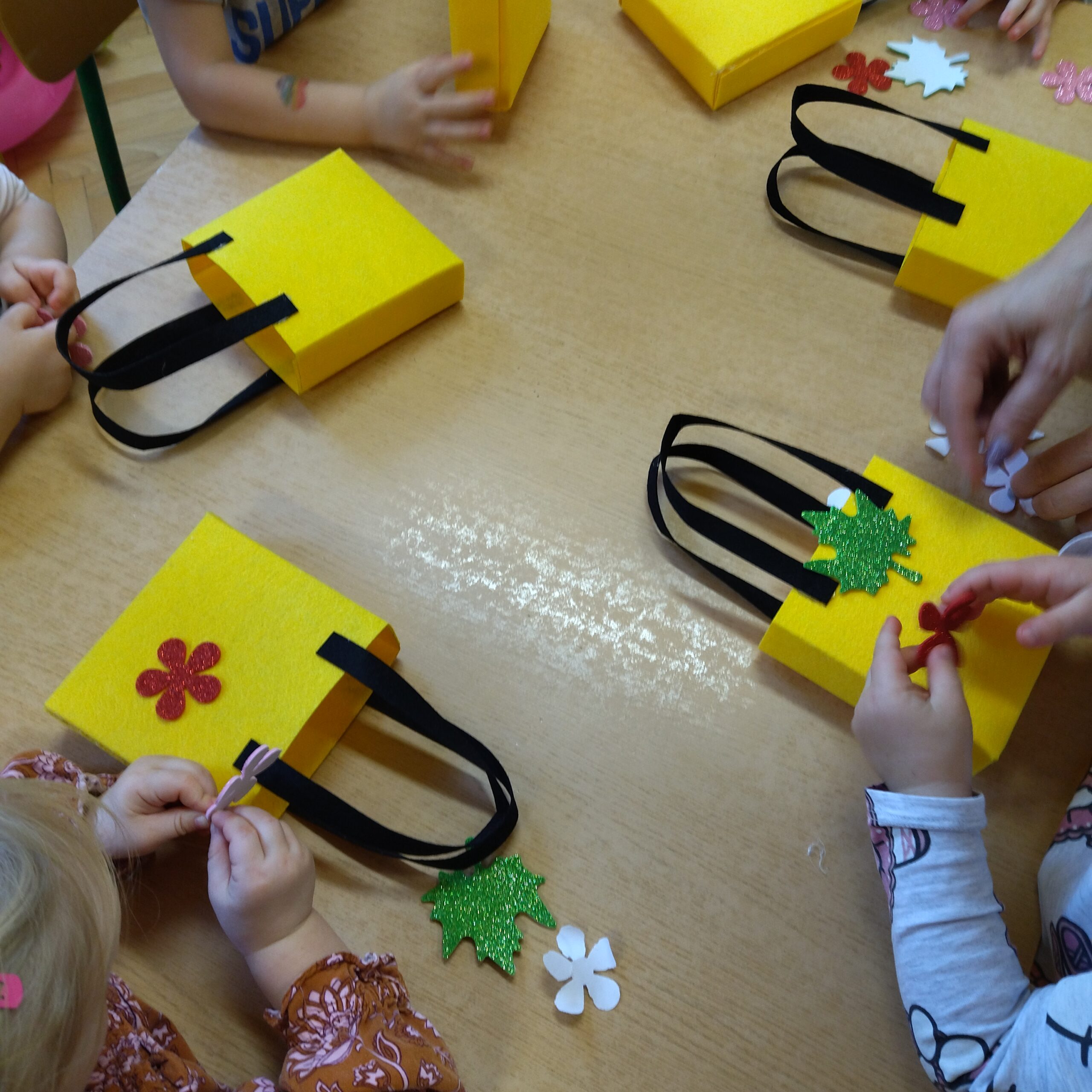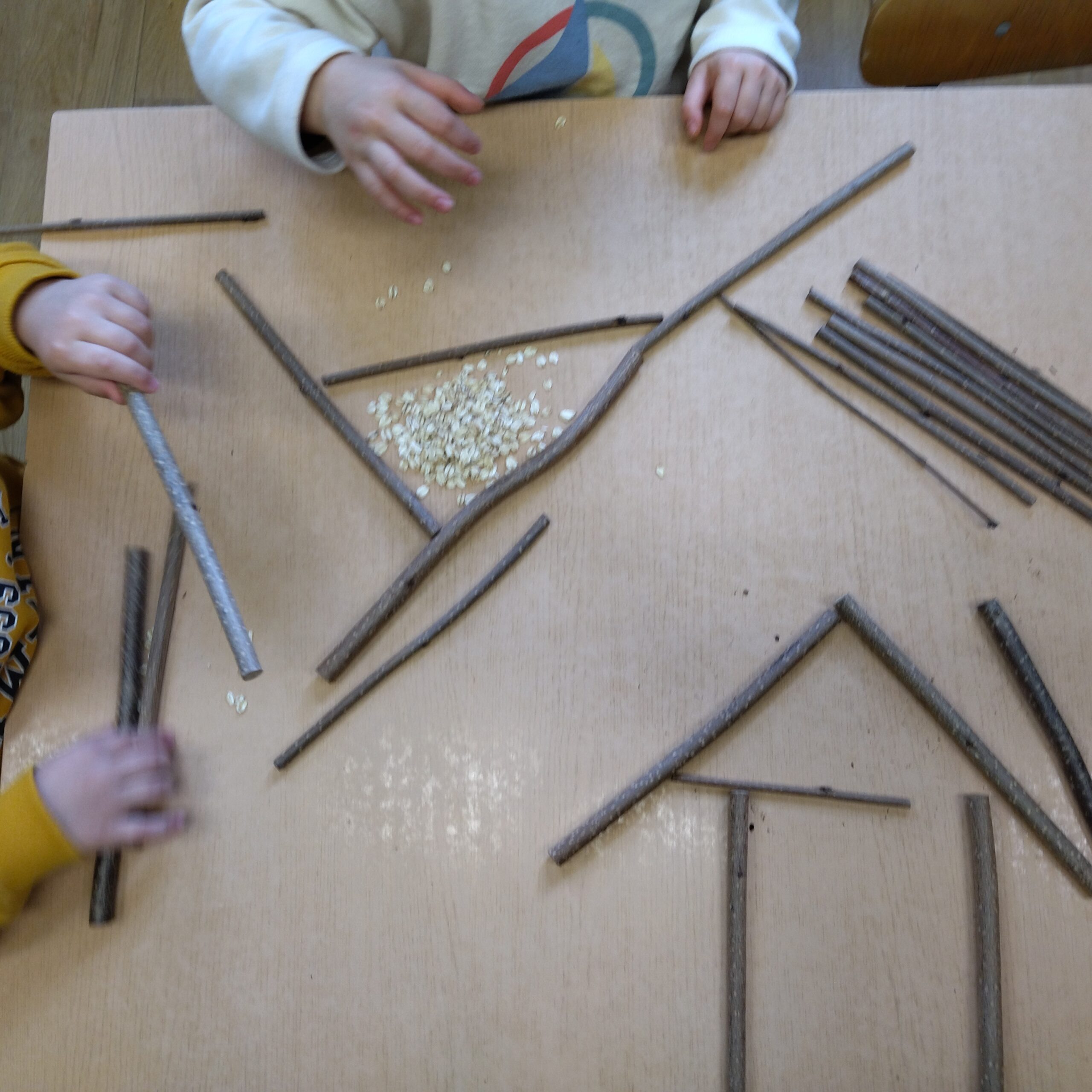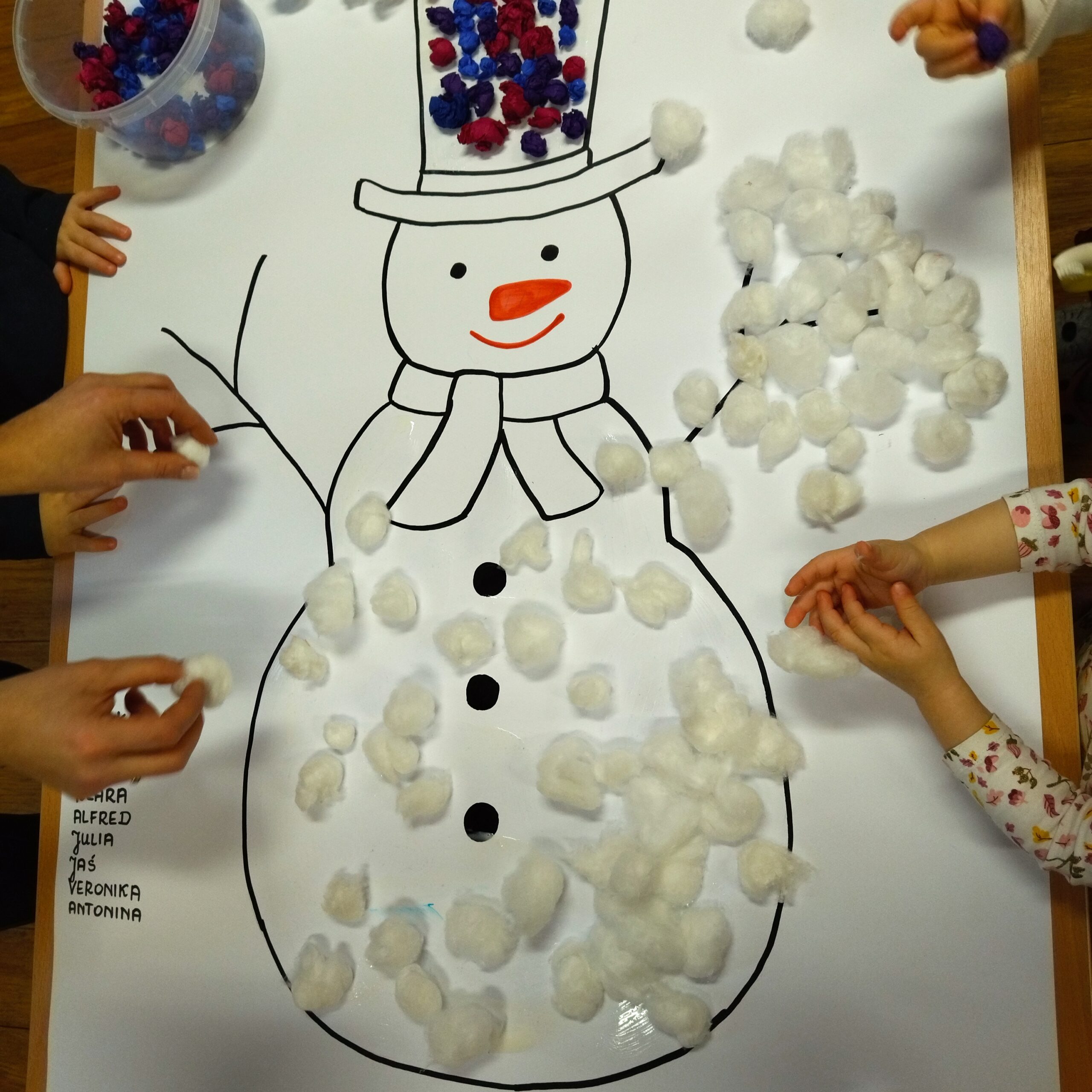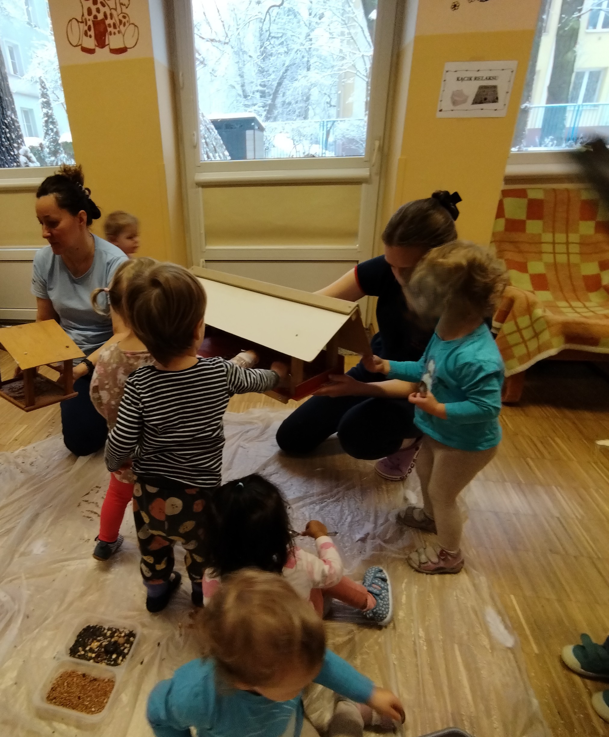 W grupie V dzieci bliżej poznały budowę oraz zastosowanie karmnika dla ptaków. Pani Opiekunka opowiedziała dzieciom z jakich materiałów możemy zbudować karmnik, jakie ptaki z karmnika korzystają oraz jakie nasionka możemy zostawić w karmniku. Następnie dzieci, które były chętne mogły wsypać nasionka słonecznika, siemię lniane, grykę do karmnika. Po wysłuchaniu informacji o karmniku Pani Opiekunka zaprosiła dzieci do stoliczków, gdzie czekały przygotowane dla każdego dziecka patyczki wierzby. Dzieci miały za zadanie według własnej wyobraźni zbudować karmnik dla ptaków. Powstały fantastyczne i zróżnicowane karmniki. Każde dziecko mogło do swojego karmnika wsypać nasionka. Wszystkie dzieci z chęcią brały udział w tych przygotowanych przez Ciocie aktywnościach. Dzieci z grupy V brały również udział w magicznych eksperymentach przygotowanych przez jedną z Cioć. Dzieci do przygotowanego wcześniej słoika z olejem wsypywały mąkę i tak powstały unoszące się do góry śnieżynki. Powstała również (z wody i talku wsypanego przez dzieci do miski) „lodowa tafla”, która „pękała” podczas wkładania do miski plastikowych zwierzątek (których nogi wcześniej delikatnie zanurzone były w płynie do mycia naczyń). Dzieci wsłuchały również opowiadania o aktualnej porze roku – zimie. Dzieci dowiedziały się czym charakteryzuje się zima, co możemy ciekawego zimą robić, jakie zwierzęta zapadają w sen zimowy i jakie ptaki odlatują do ciepłych krajów, oraz kiedy się zaczyna i kończy obecna pora roku. Po krótkim opisie zimy dzieci, które były chętne stworzyły przepiękny zimowy krajobraz przedstawiający zaspy śniegu wraz z bałwankami, śnieżynkami i choinkami.