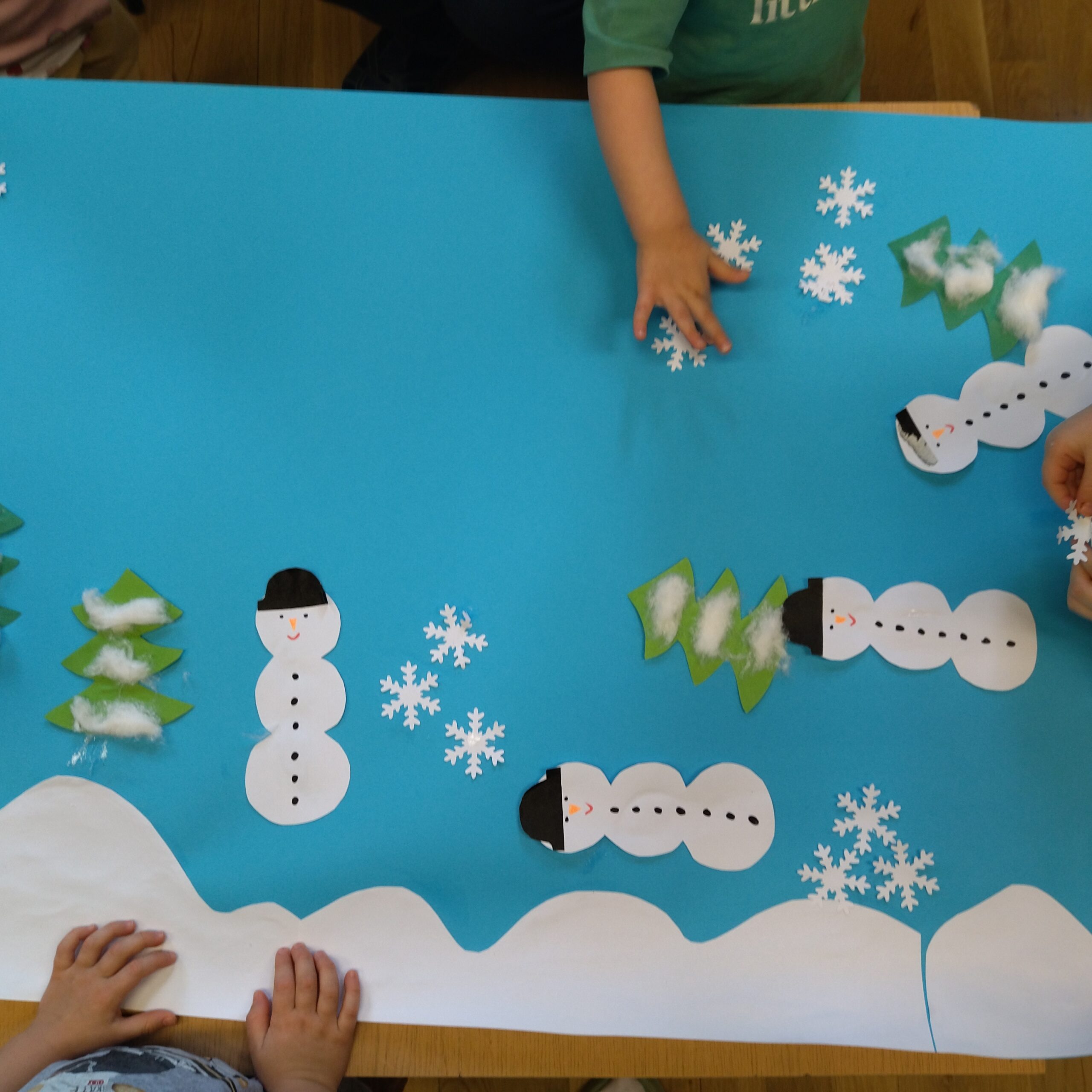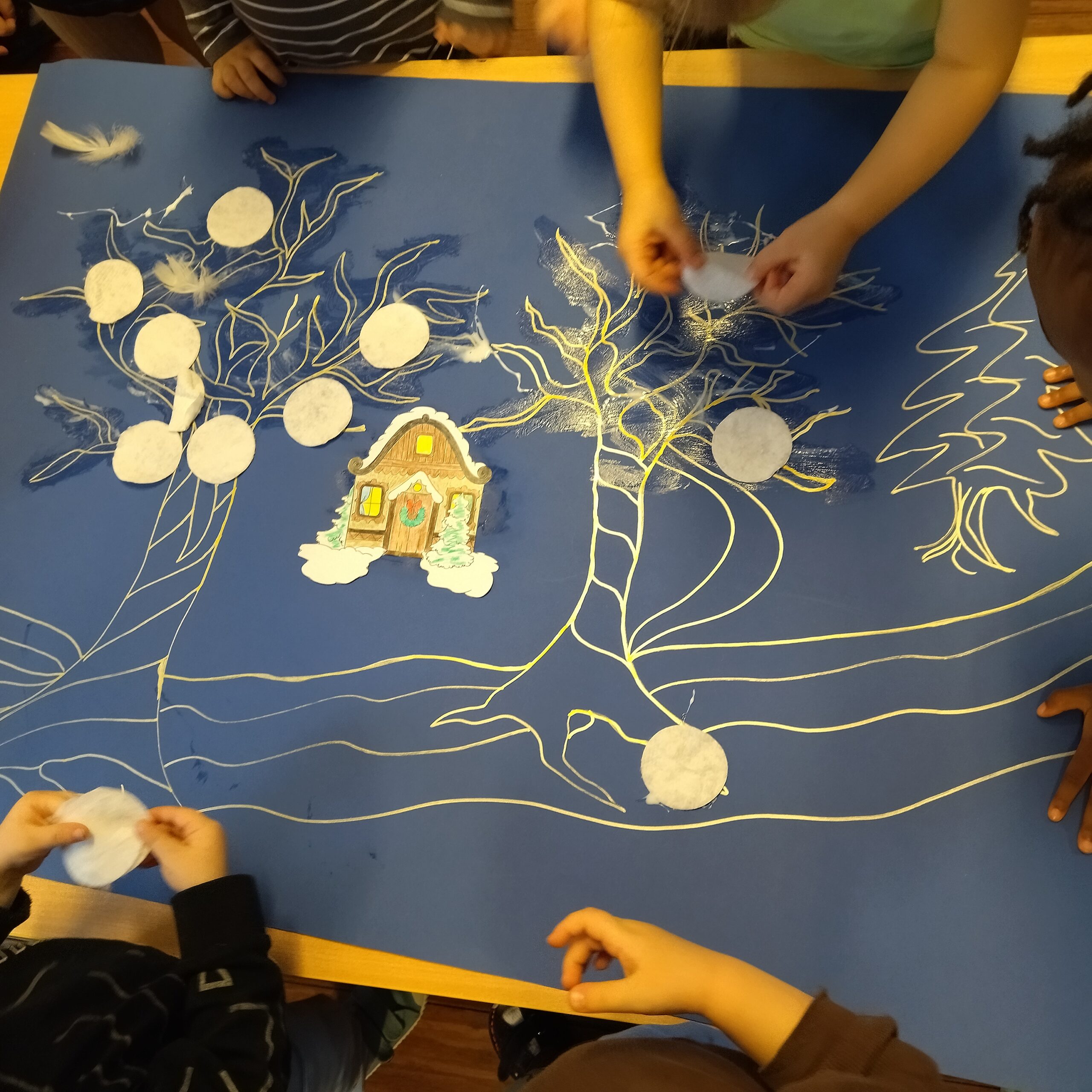 W grupie III dzieci poznały bliżej aktualną porę roku – zimę. Dzieci miały okazję oglądać na obrazach piękne zimowe krajobrazy, poznały jakie są oznaki zimy oraz co możemy ciekawego zimą robić. Dowiedziały się również jakie ptaki zimują w Polsce oraz jak możemy im pomóc w tym mroźnym okresie. W okresie zbliżających się ferii zimowy powstały pomysły na poszczególne aktywności: jazda na sankach, lepienie bałwana, lepienie śnieżek oraz domek ze śniegu – iglo. Na sam koniec dzieci, które były chętne stworzyły wspólny zimowy krajobraz przedstawiający las, zimowy domek, śnieżynki oraz bałwanki.