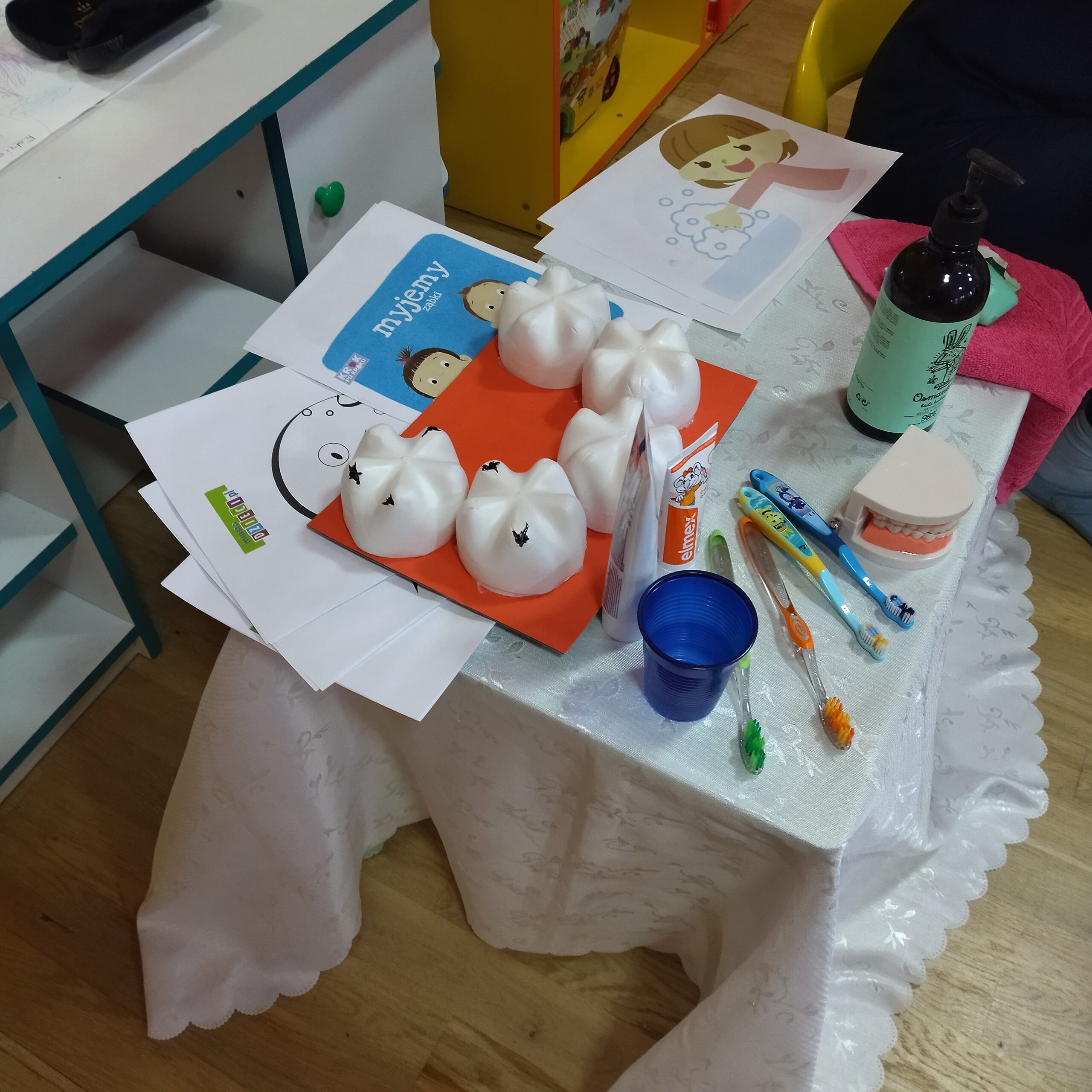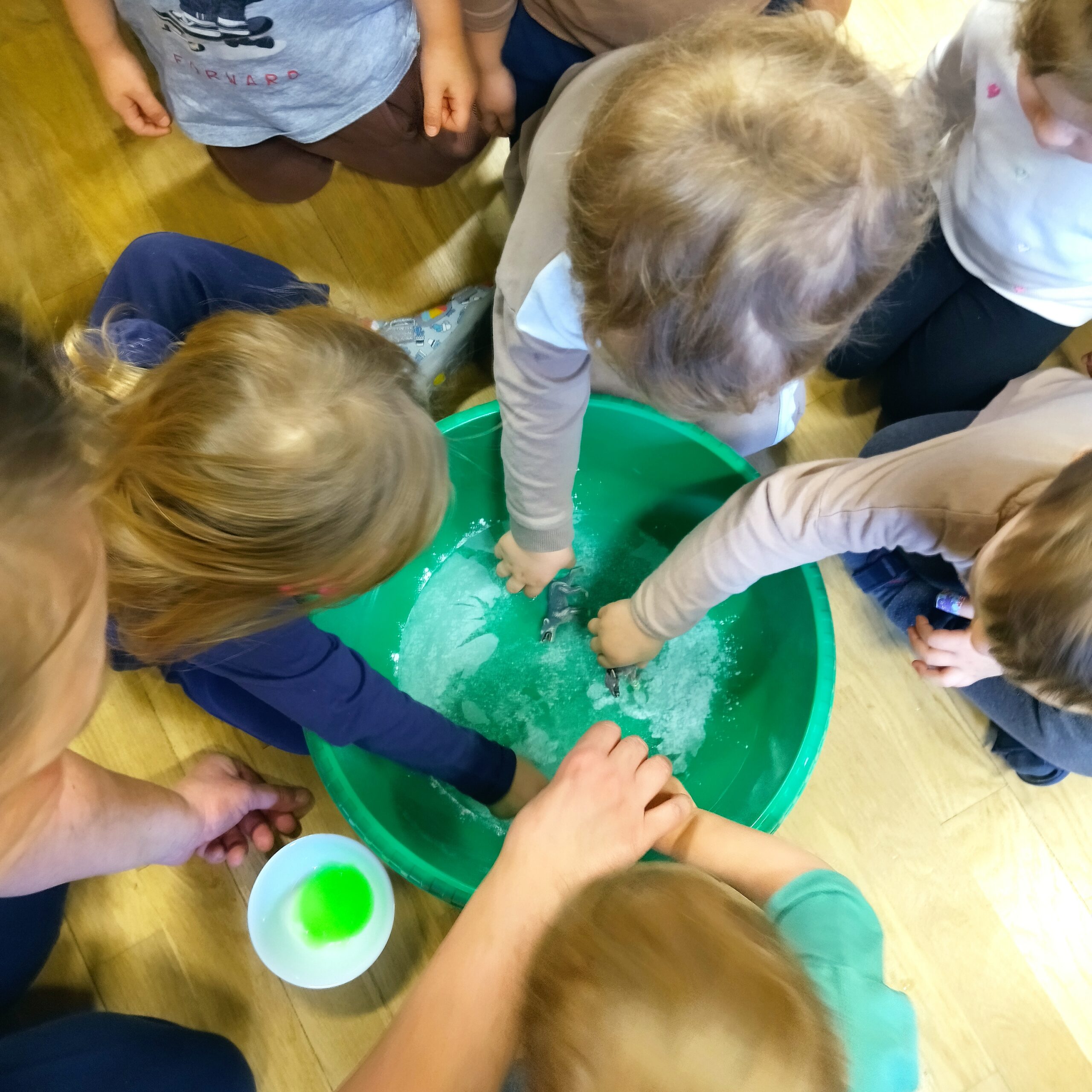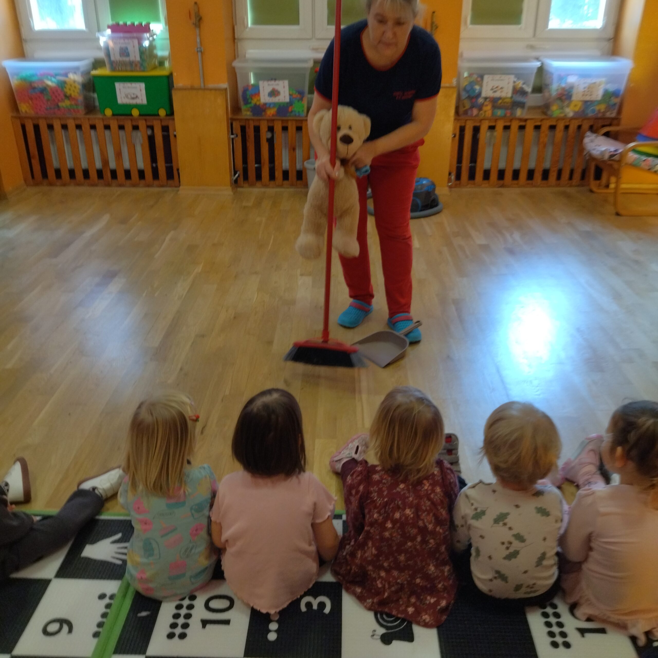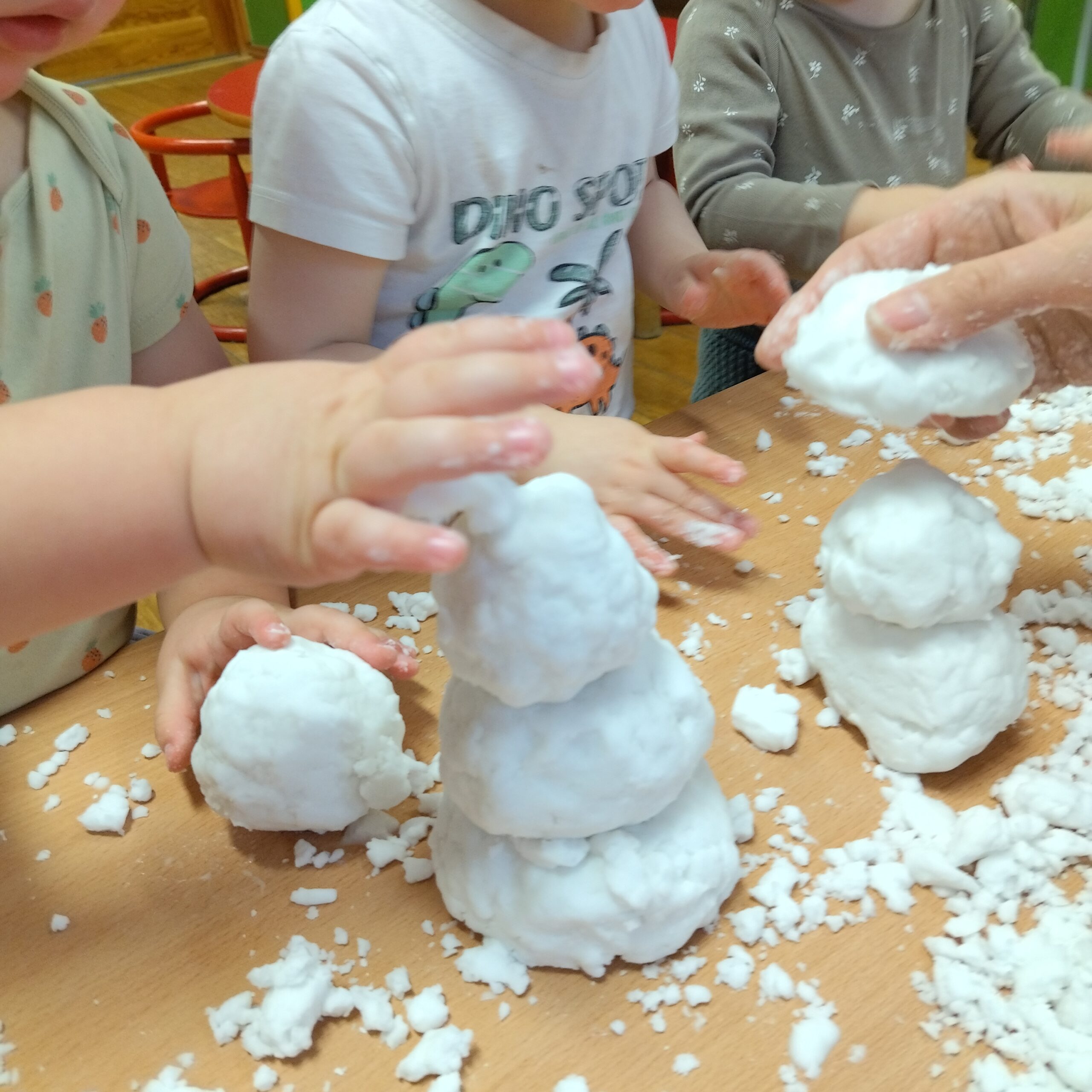 Grupa IV swoją uwagę skupiła na czynnościach czystościowych, myciu ząbków oraz na zabawach sensorycznych ze śniegiem. W tej grupie Pani Opiekunka przedstawiła bliżej dzieciom jak dbać o higienę jamy ustnej. Dzieci dowiedziały się dlaczego trzeba myć ząbki oraz jakie są konsekwencje nie dbania o jamę ustną. Dzieci dowiedziały się również, że często trzeba myć rączki. Następnie wraz z Opiekunkami zatańczyły do piosenki „Szczotka, pasta” oraz wykonały pracę plastyczną – wkładały rączki do farby i odbijały je na kartonie z narysowanym kranem. Następnie – ponieważ rączki były ubrudzone cała grupa poszła do łazienki umyć rączki Dzieci, które nie chciały brać udziału w wymienionych wyżej aktywnościach bawiły się w sali ruchowej w basenie z piłeczkami. Dzieci również brały udział w sportowych aktywnościach związanych z dbaniem o porządek. Pani Opiekunka stworzyła „czystościowy tor przeszkód”, a dzieci miały za zadanie wykonać poszczególne części toru przy pomocy mopa do mycia podłóg oraz szufelki i miotły. Wszystkie dzieci bardzo chętnie brały udział w zawodach, a następnie poszły stworzyć prace plastyczną przestawiającą odkurzacz albo wiadro z mopem. Dzieci w tej grupie miały również bardzo dużo zabaw ze śniegiem, z którego powstawały śnieżne babeczki, bałwanki oraz kolorowe pejzaże, dzięki pipetkom z farbą oraz wodą.